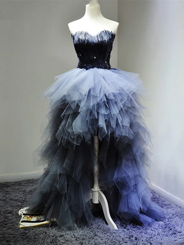 Дымчатое, серое, с перьями, длинное, без бретелек, пышное платье на...