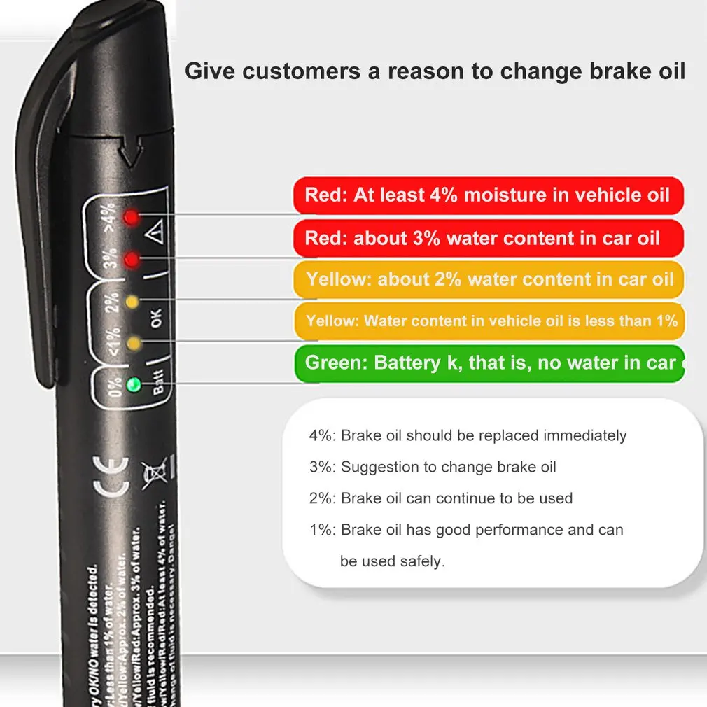 Package Included:1 * Brake Fluid TesterNotes:1.Due to the difference between different monitors,the picture may not reflect the actual color of the item.2.Due to different personal measuring techniques,there might be 1-3cm error of the physical.Thank you!