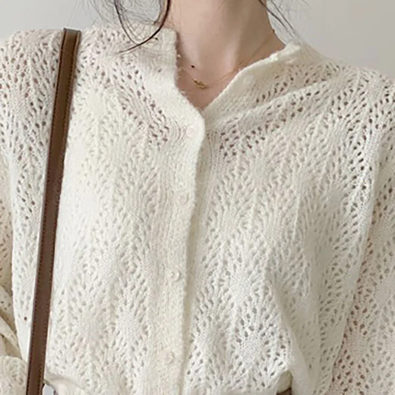 Женский ажурный кружевной вязаный свитер, элегантный однобортный Свободный Топ с круглым вырезом и рукавами-фонариками, осень 2021