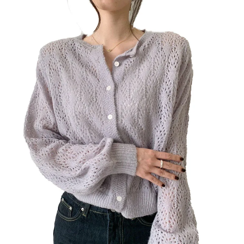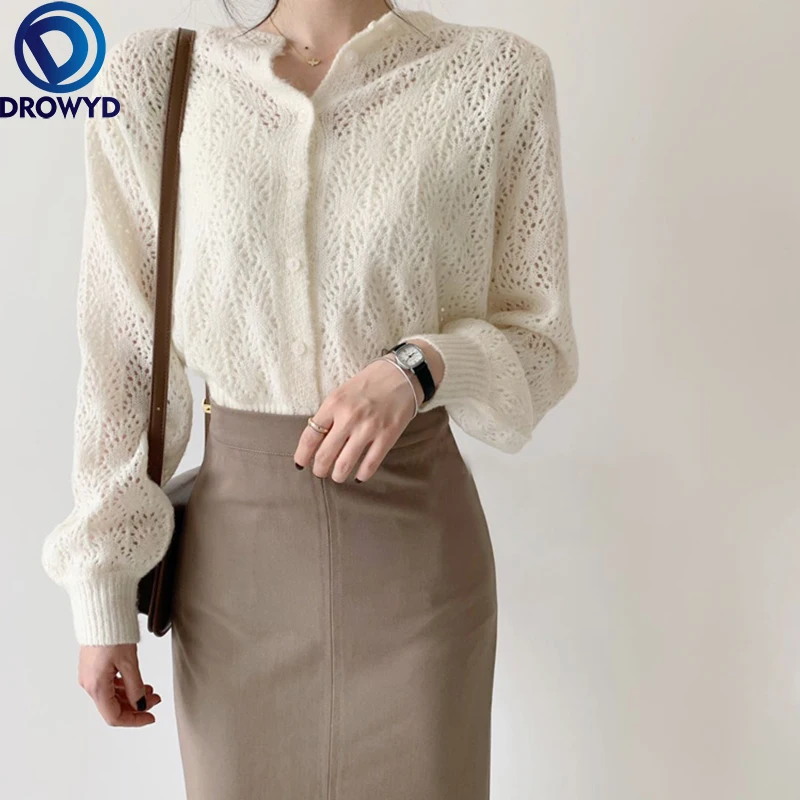DROWYD2021 летнее Новое поступление 2021 осенний женский ажурный вязаный свитер с круглым вырезом и рукавами-фонариками элегантный однобортный Свободный Топ