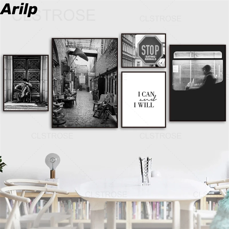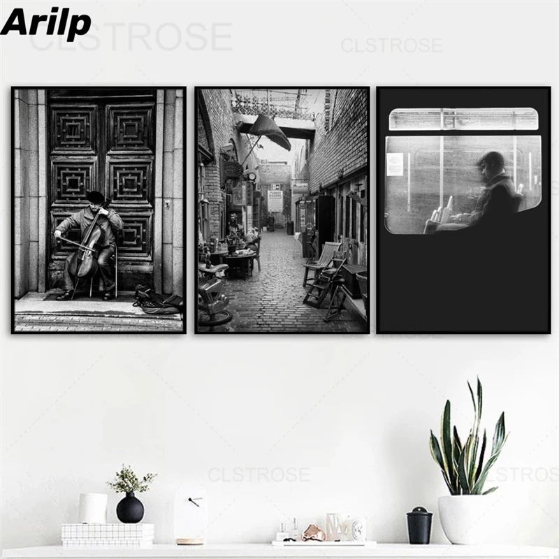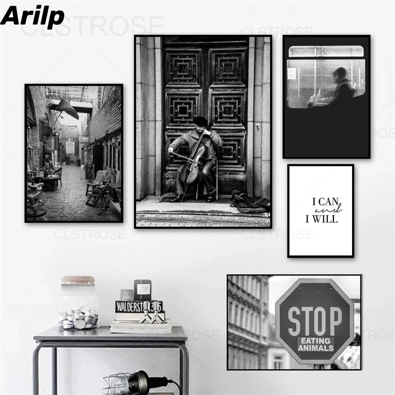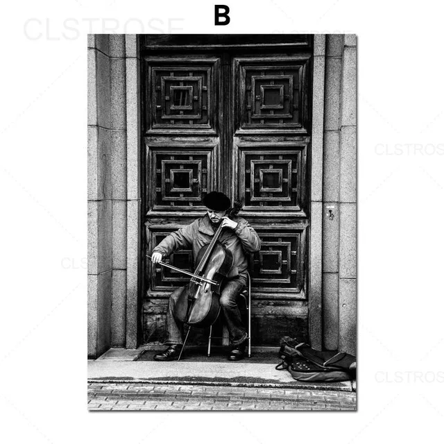 Скандинавская улица Cellist, винтажный декор, холст, живопись, пейзаж, черно-белый ретро постер, интерьер, настенное искусство, картина для гостиной