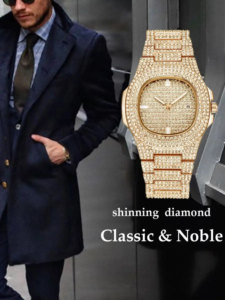 Часы наручные мужские сверкающие, модные брендовые роскошные золоти...