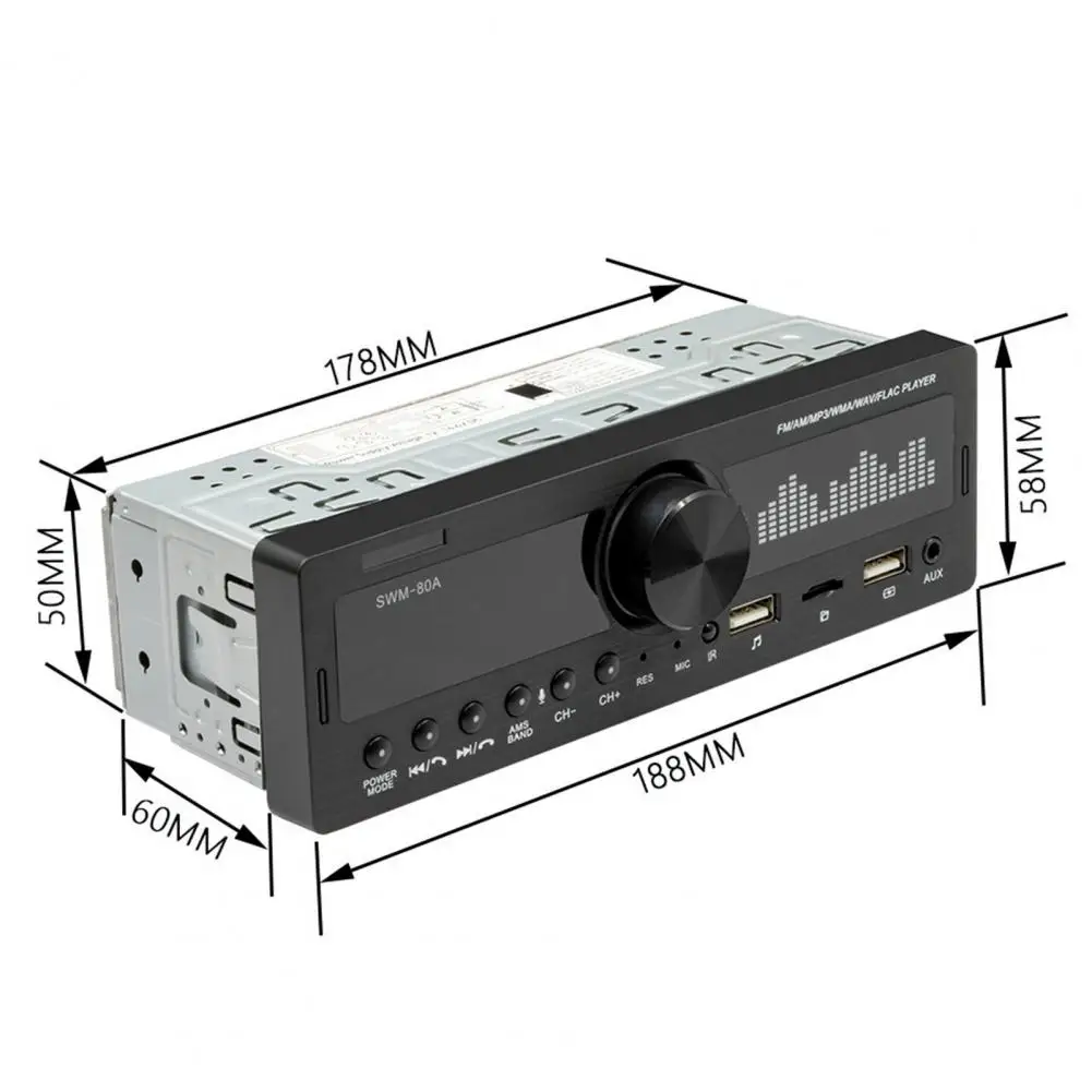 SWM-80A надежный автомобильный стерео плеер двойной USB вход AUX цветной светильник многофункциональный MP3 плеер аудио радио приемник для авто Описание:Радиопроигрыватель имеет различные функции, такие как радио (FM/AM), кардридер, U диск, AUX, Bluetooth-совместимый, RCA аудиовыход, копия источника звука и красочное освещение.Это радиопроигрыватель, который может подключаться к приложению на ваш мобильный телефон, чтобы реализовать функции поиска автомобиля и мобильный телефон голосового ассистента.Изготовлен из аппаратного обеспечения, автомобильный радиопроигрыватель портативный, практичный и прочный.Длина радио плеер является 18,8 см, ширина 5,8 см и высотой 6 см.Подходит для автомобилей и грузовиков. Наименование товара: автомобильный радиоприемникМатериал: фурнитураЦвет: черныйМодель: SWM-80AПоддержка аудиоформата: MP3/WMA/WAV/FLACЯзык системы по умолчанию: английскийВерсия bluetooth-гарнитуры: 4,0Характеристики: многофункциональный, высокая производительность, долговечностьИнформация о размере:18,8 см x 5,8 см x 6 см/7,4 "x 2,28" x 2,36 "(прибл.) Примечания:Благодаря светильник и экрана Цвет Товара может быть s светильник ly отличается из-за характеристик монитора компьютера.Возможны незначительные отклонения в размерах из-за различных измерений вручную. Посылка включает в себя:1 хост2 x Кабель Питания1 пульт дистанционного управления1 x Руководство пользователя1 х ключ для разборки