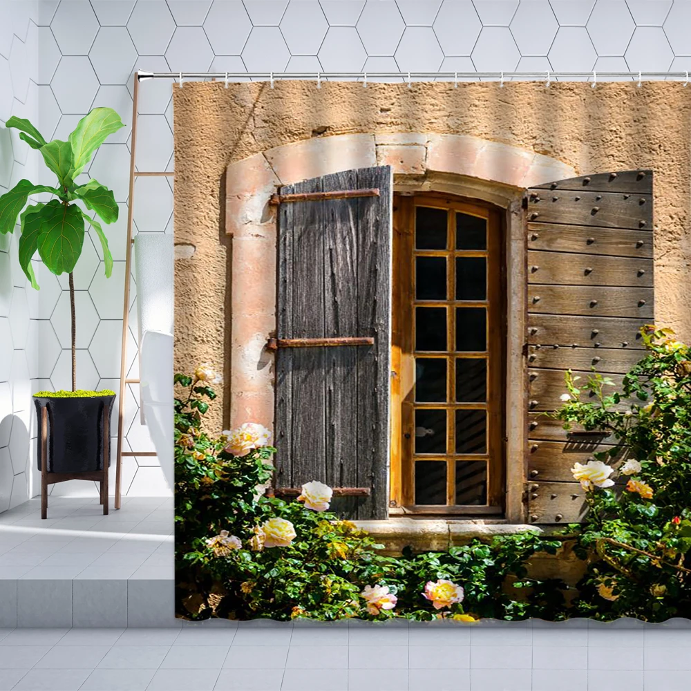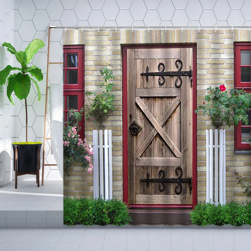 Занавеска для душа в стиле ретро, с деревянными дверями и цветами, ...