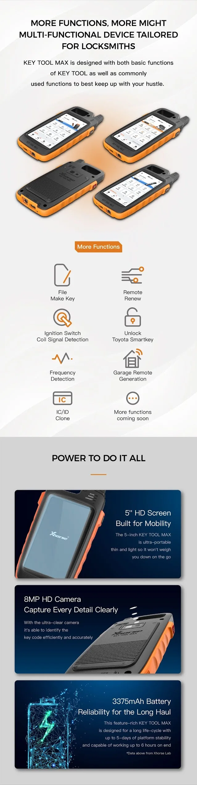 KEY TOOL MAX-это профессиональное умное устройство с множеством функций для слесаря. Встроенный интерфейс связи Bluetooth и Wi-Fi позволяет подключать устройство к машине для резки ключей Xhorse, мини-инструменту OBD и другим продуктам для различных операций.