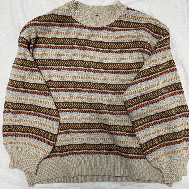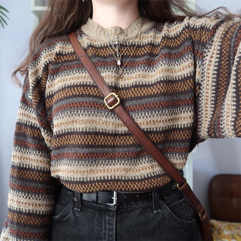 Пуловер женский полосатый оверсайз, винтажный Вязаный топ с круглым вырезом и длинным рукавом, уличная одежда