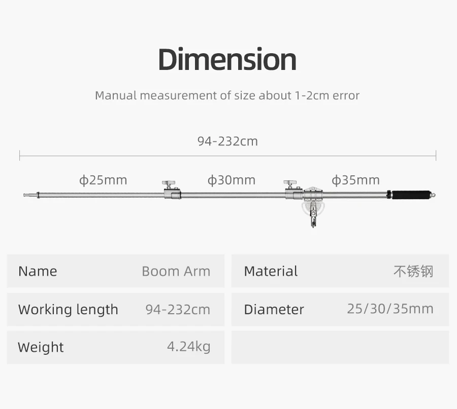 Эта стрела изготовлена из нержавеющей стали. Он идеально подходит для студии или на месте съемки и отлично подходит для задней панели светильник фоны или волос светильник.
