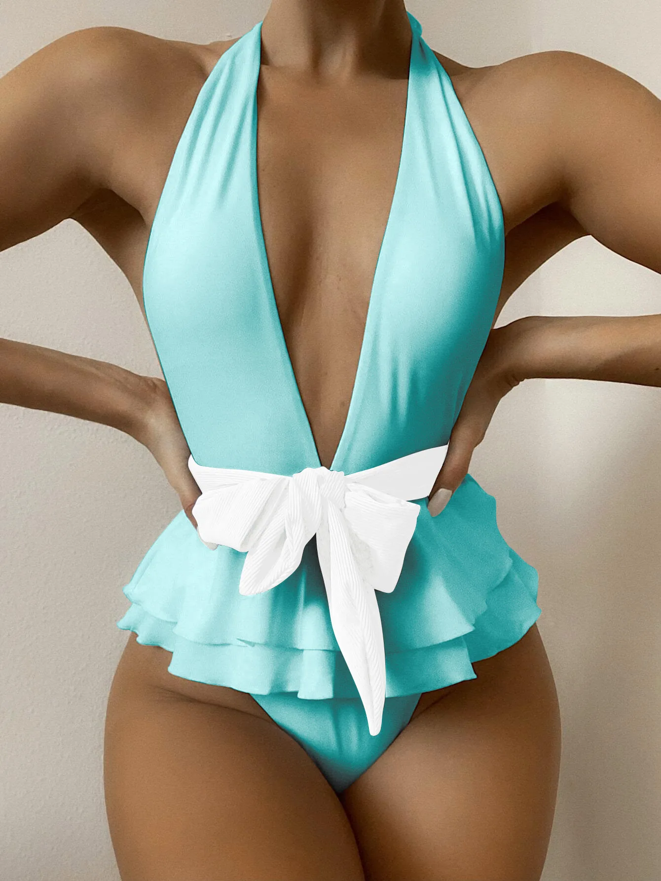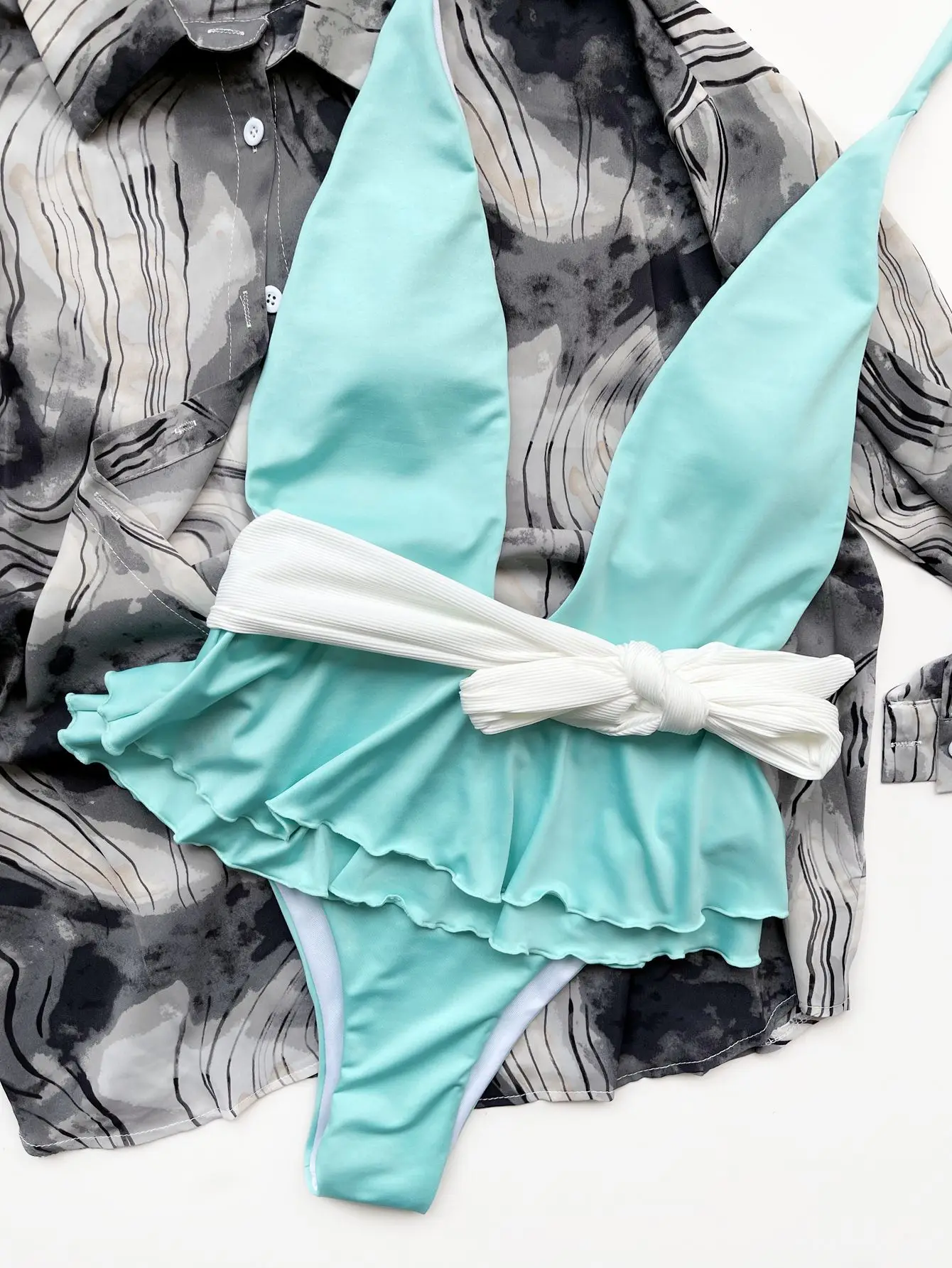 Купальник с глубоким V-образным вырезом женская сексуальная юбка оборками и поясом стринги высоким Цельный купальник открытой спиной купальный костюм монокини 2022 женский слитный новинка купальники для женщин боди