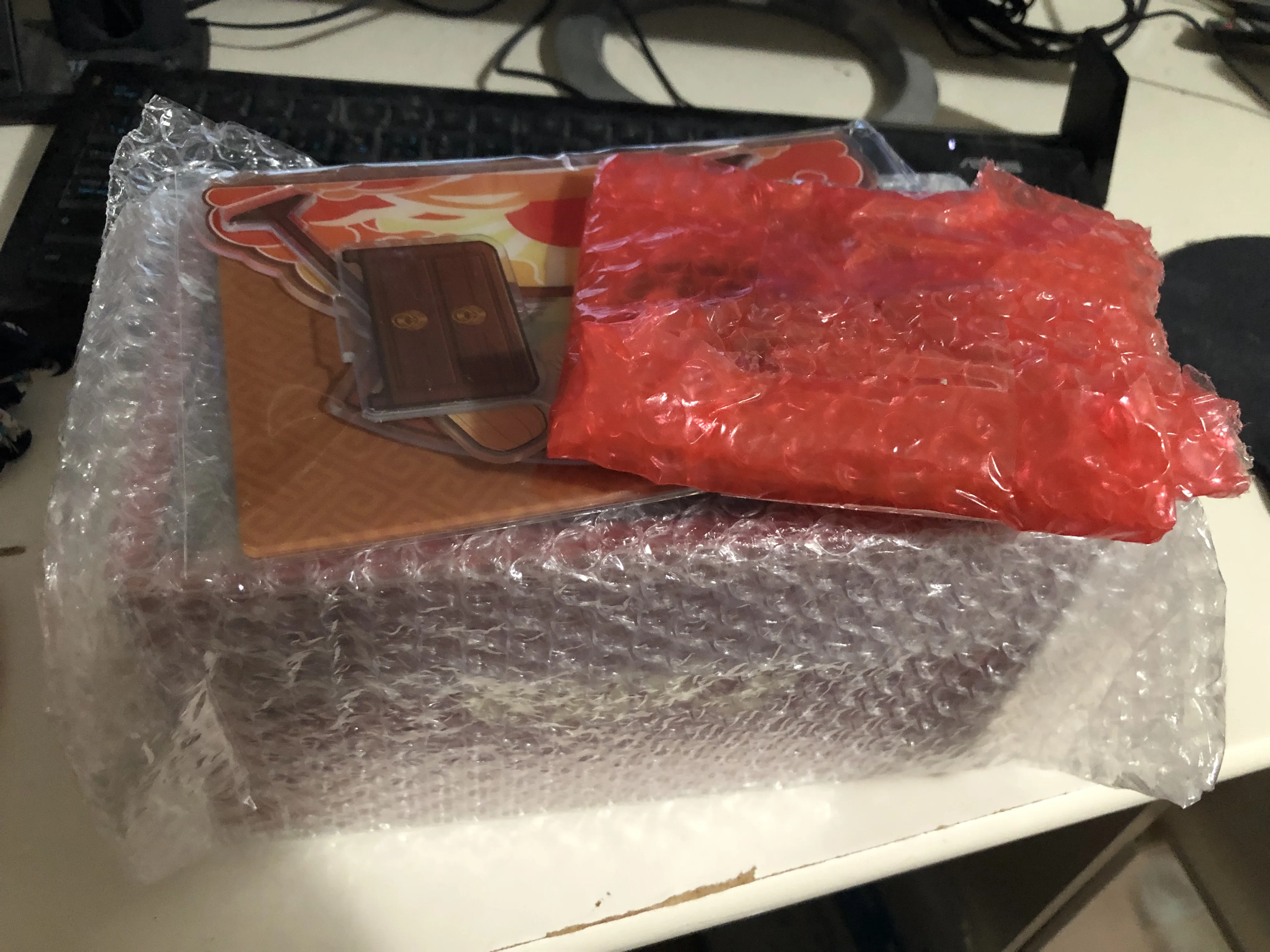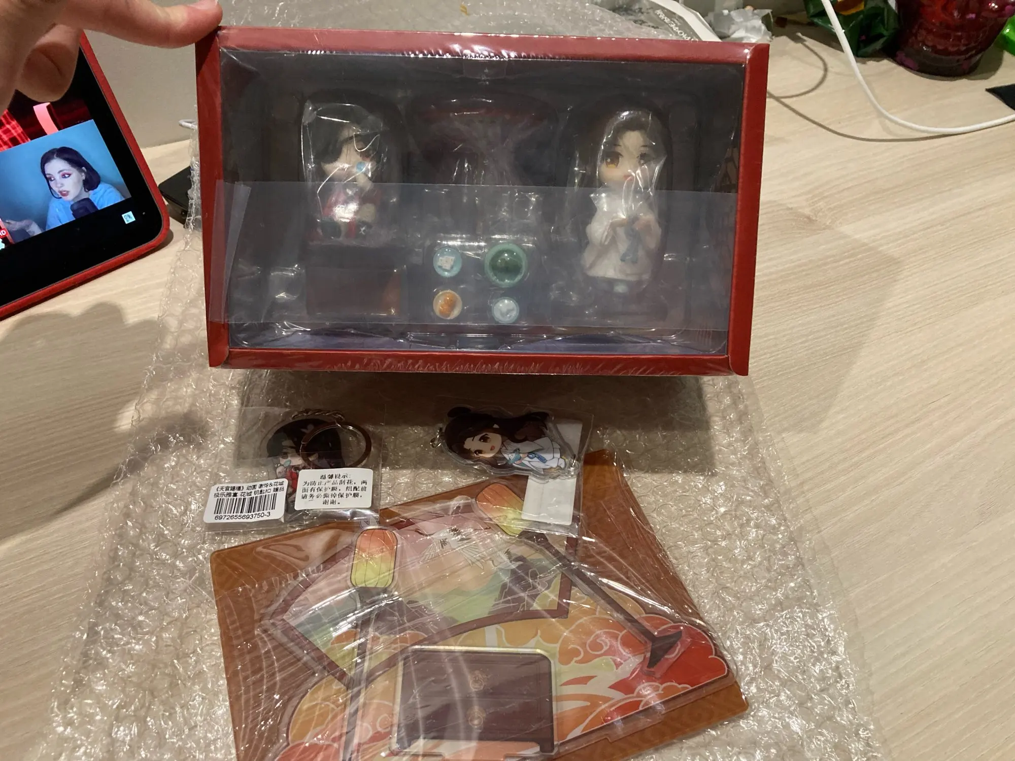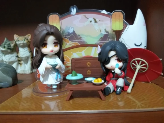 Заказывайте,не разочарует!Упаковка оказалась достойной,ничего не повредилось.Фигурки оригинальные,глазу и на ощупь приятны.Также,бонусом положили открытки(?) и что-то по типу значков(?).Композиция красивая,ничего не скажешь.В дополнение к фигуркам шёл стенд,он также красив,как и фигурки.Однако,его стенки сложно вставляются.Также,заместо стенда можно использовать коробку от фигурок.