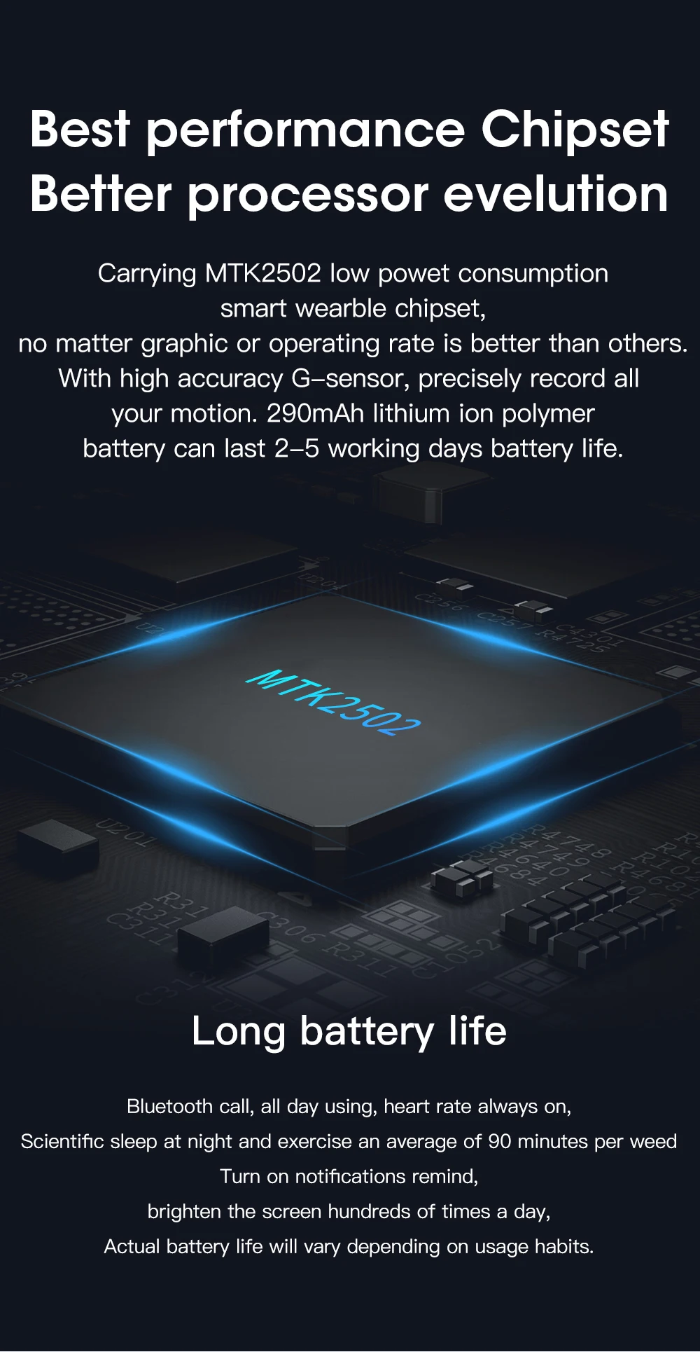 Переноска набора микросхем MTK2502 с низким энергопотреблением, не имеет значения, графический или рабочий уровень лучше, чем у других с высокой точностью g-датчика, точно записывает все ваши движения. Литий-ионный полимерный аккумулятор 290 мАч может работать 2-5 рабочих дней