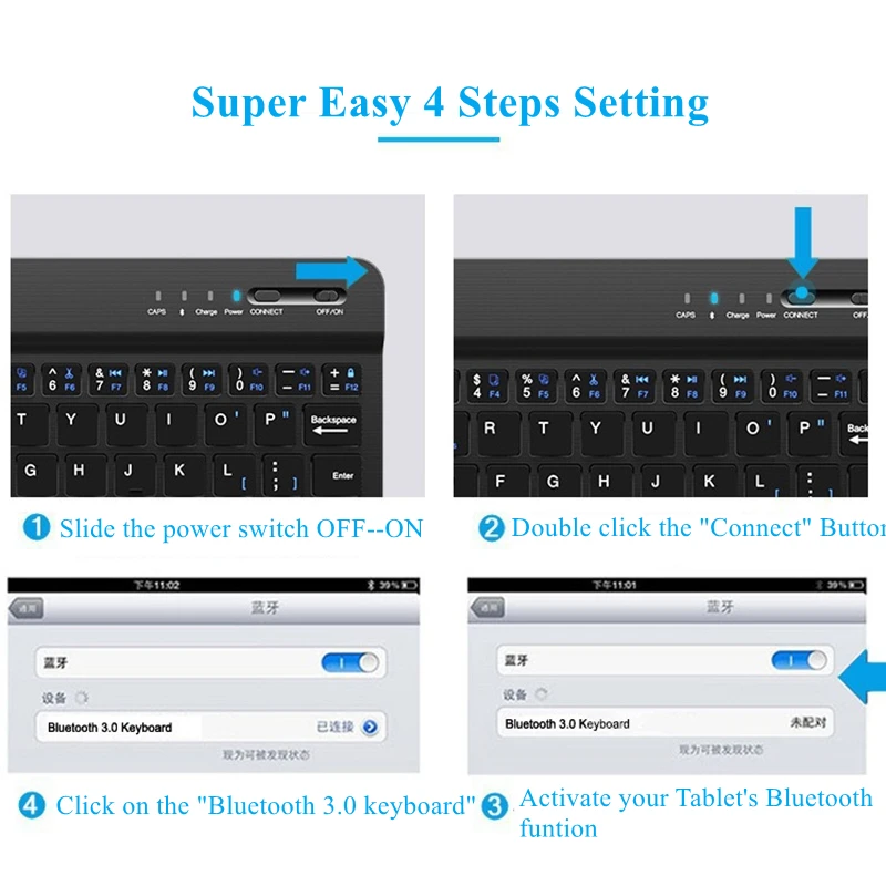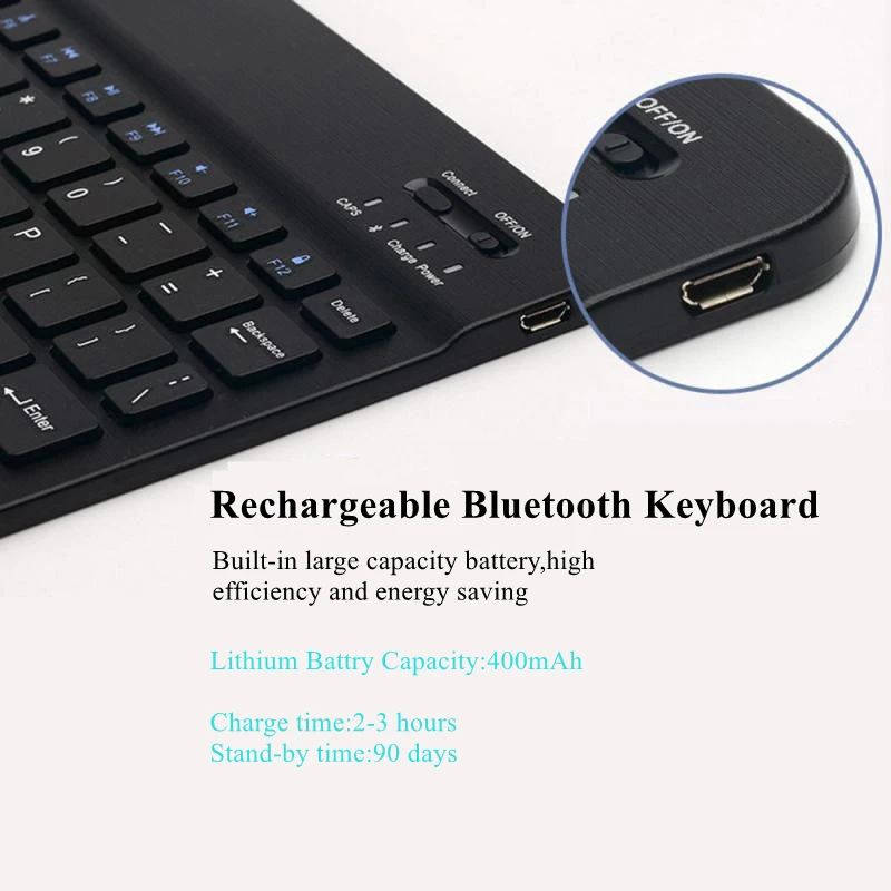 Универсальная беспроводная bluetooth-клавиатура использует встроенный литиевый аккумулятор, его можно легко заряжать через usb-кабель, не нужно менять аккумулятор. Встроенная перезаряжаемая батарея невероятно долговечна, время работы в режиме ожидания составляет около 6 месяцев между зарядами. Беспроводная клавиатура bluetooth может автоматически войти в режим сна для экономии энергии