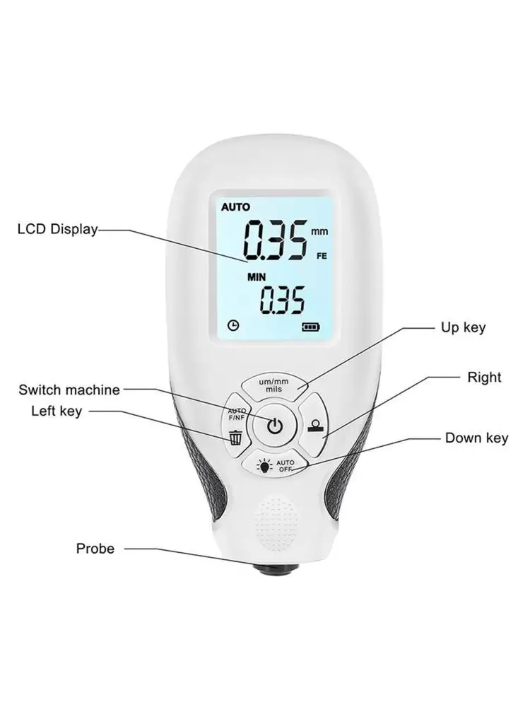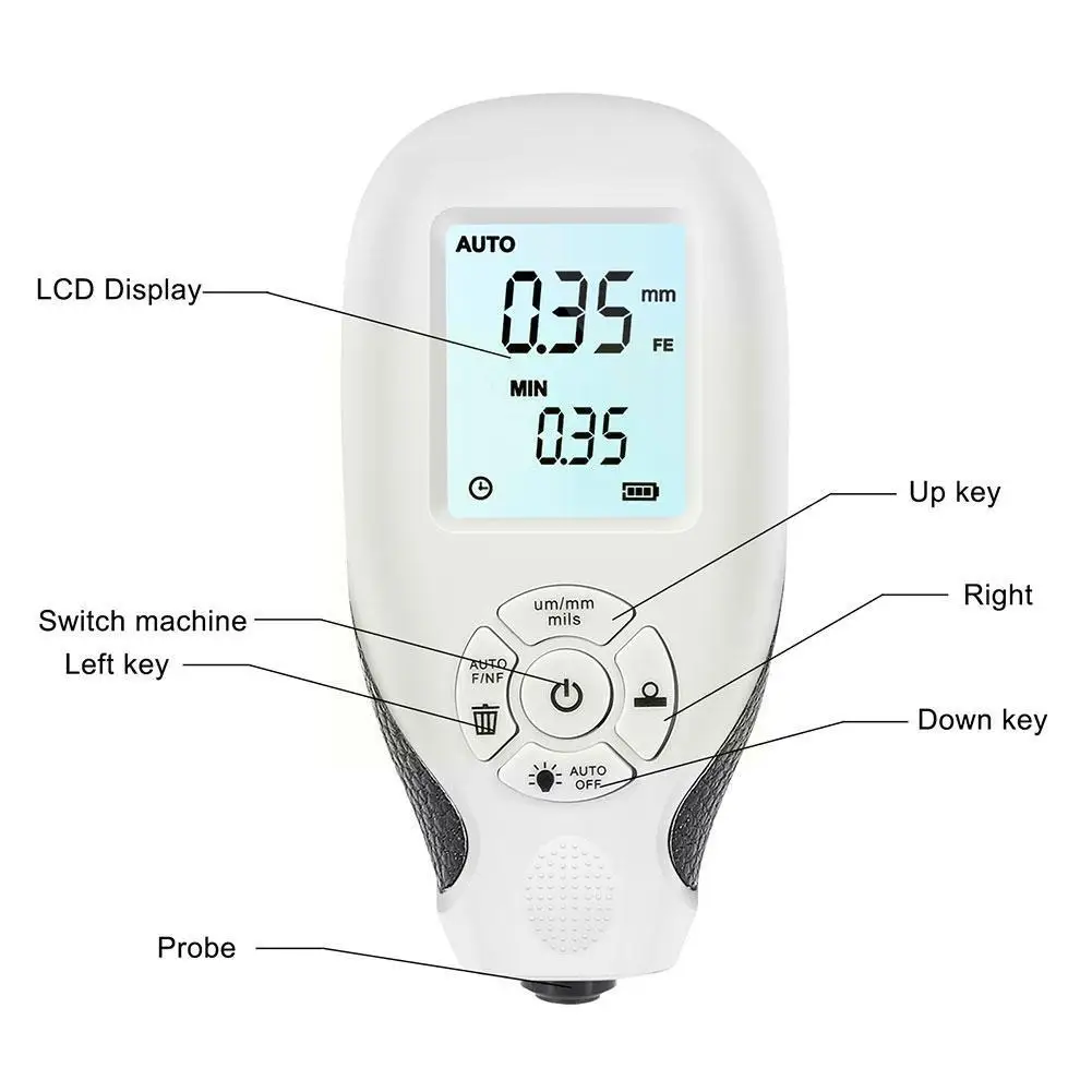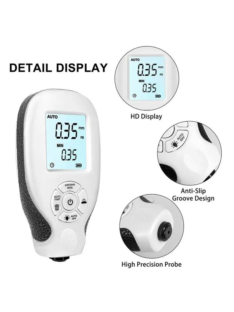 DescriptionThis is a simple and practical automotive paint coating thickness tester, mainly made of high-performance ABS and electronic materials, professional and durable, with excellent texture, which can help you complete the test work and bring you more convenience . It is made with exquisite craftsmanship, which is more precise and practical, and can well meet your needs.FeaturesColor: Black.whiteMaterial: ABS, Electronics.Resolution: 0.01mm/1mil.Measuring range: 0-2000UM.Measurement accuracy: ±(3%+1UM).Power supply: 2 1.5V AAA batteries(not included).Operating temperature: -10 degrees Celsius and 50 degrees Celsius.Made of high-performance ABS and electronic materials, it is safe and gentle, durable and practical.It has a high-definition display screen, which is intuitive and clear, allowing you to easily understand the test results.Small and useful, easy to carry, convenient for you to use at any time, will be your good choice of measuring tools.The main car paint thickness is safe and gentle, and it is very friendly to your car body.Made with excellent craftsmanship, it has excellent durability and will not be easily damaged.packing list:1 x thickness gauge1 x manual 1 x calibration sheet