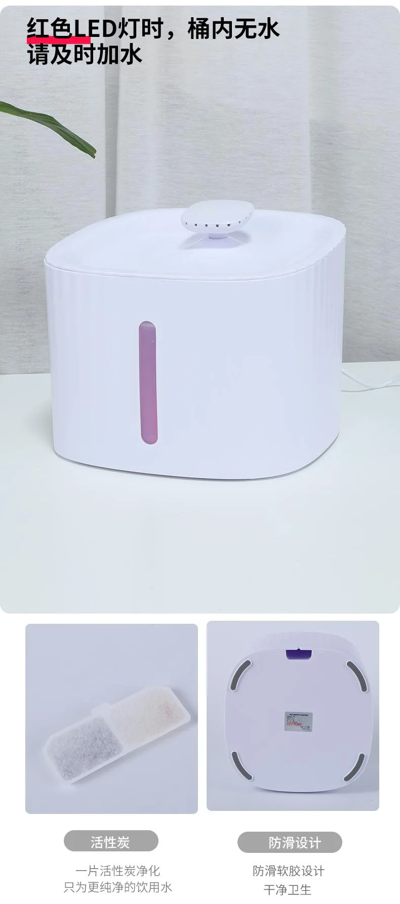 3. Фильтрация активированного угля,Четырехкратная система фильтрации: фильтр из хлопка и кокосового ореха для очистки воды.Четырехместная система фильтрации обеспечивает здоровье и безопасность питьевой воды, способствует питанию домашних животных больше воды, защищает здоровье домашних животных и продлевает срок службы водяного насоса.