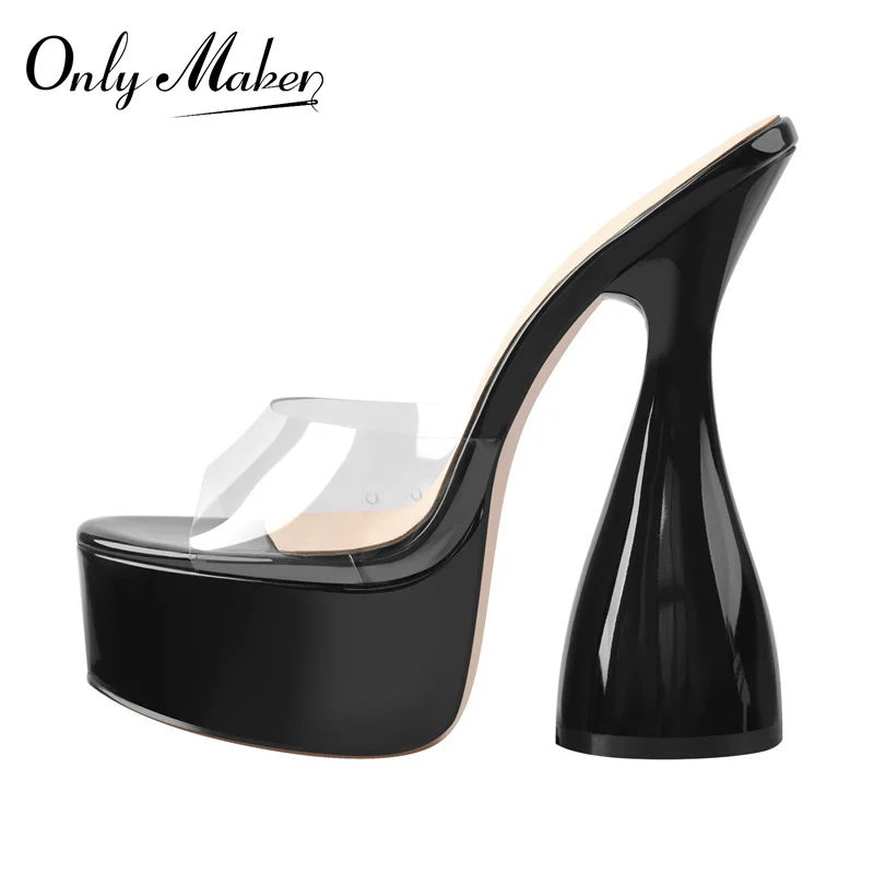 Женские босоножки без шнуровки Onlymaker, летние черные лакированные кожаные шлепанцы на высоком каблуке с открытым носком и ПВХ ремешком, большие размеры, Повседневные тапочки