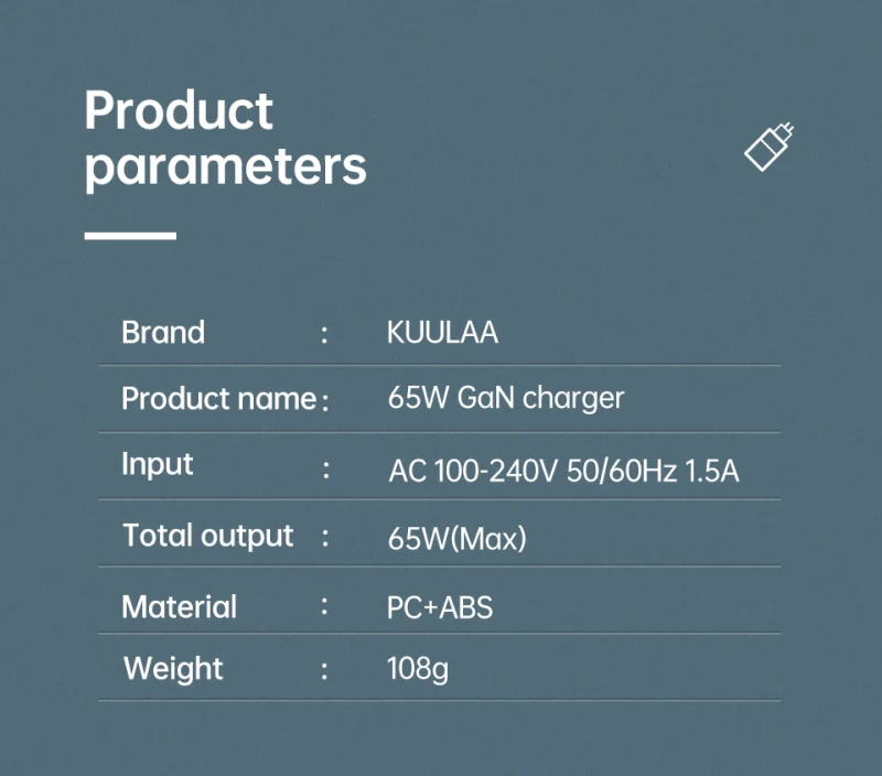 USB-A C Зарядное устройство Вход Напряжение: AC100-240V 50/60Hz Выходное напряжение Напряжение: USB-C 5V3A/9V3A/12V3A/15В/3A/20V3.25A(65 Вт) USB-A 3,6-6,5 V/3A, 6,5-9 В/2A, 12 В/1.5A(20 Вт) двойной порт Выход: USB-C(45 Вт) USB-A(20 Вт)