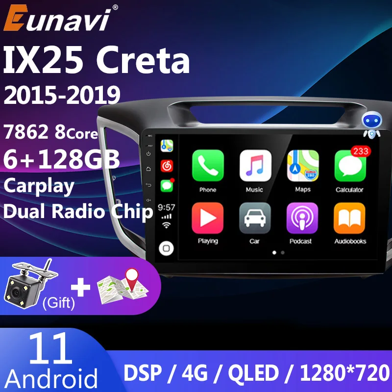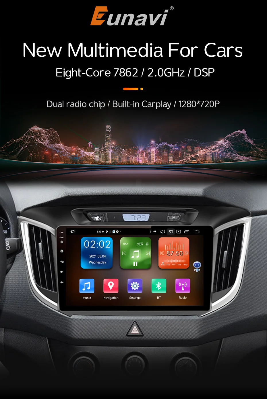 Автомагнитола Eunavi, 2 DIN, Android 11, мультимедийный видеоплеер для Hyundai Creta ix25 2015-2019, головное устройство, DVD, GPS, Navi, 4G, 8 ядер