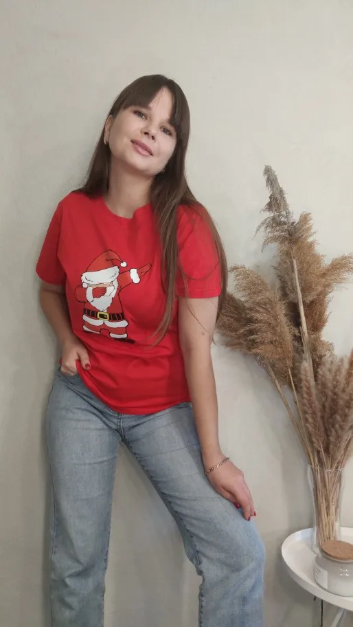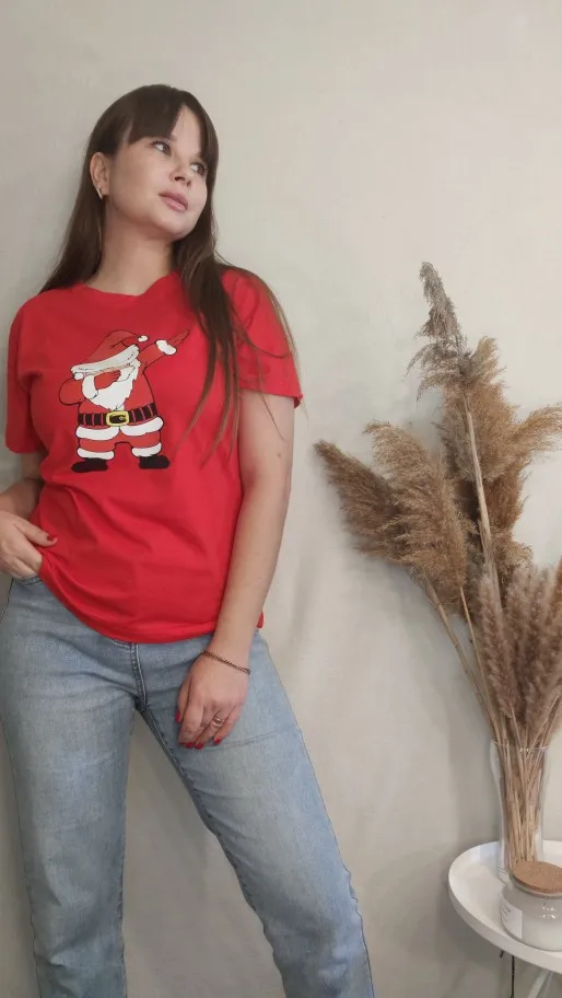 Классная футболки с новогодним принтом Цена 377руб. Размеры есть от m до xxl. Мои параметры: охват груди -96 см, охват талии - 77 см, рост - 157 см. Взяла размер l Футба была упакована в простой прозрачный пакет. Сзади был нашит лейбл магазина, на котором висела картонная бирка с кучей разной информации на китайском. Пошив очень хороший, фабричный. На мой взгляд, все сделано достаточно аккуратно и качественно. Брака, лишних дырок или пятен я не нашла. Придраться не к чему. Рекомендую.