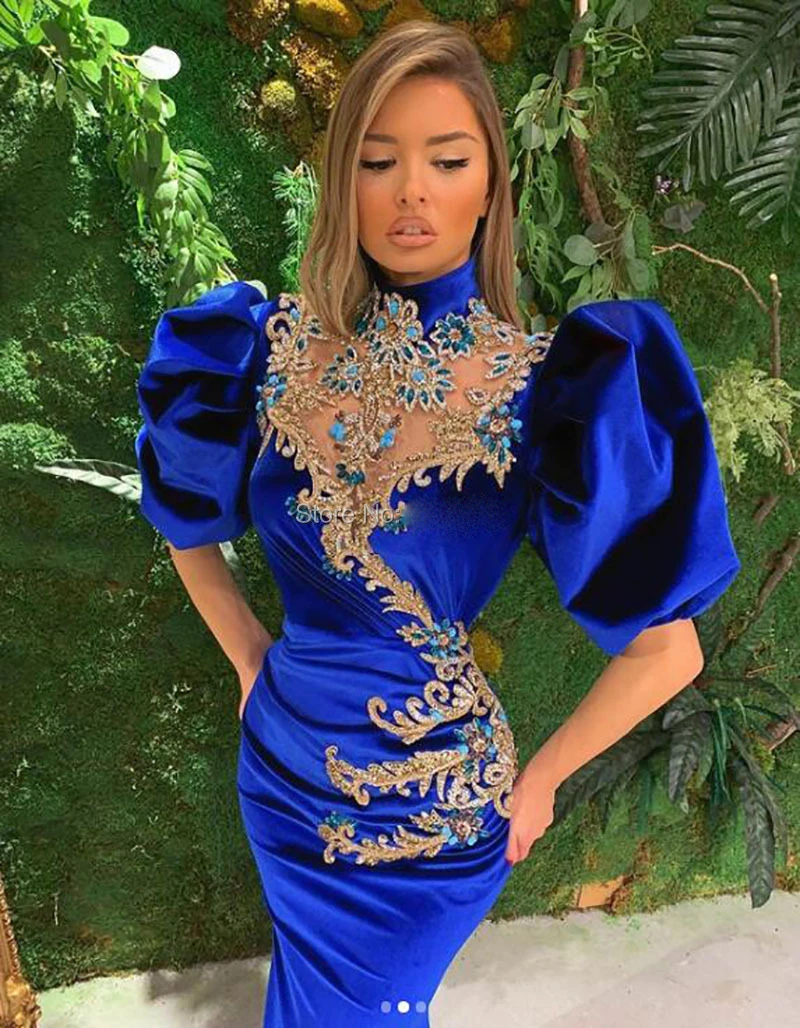 Женское бархатное платье-русалка, длинное вечернее платье синего цвета с высоким воротником, расшитое бисером, в африканском стиле, для выпускного вечера,