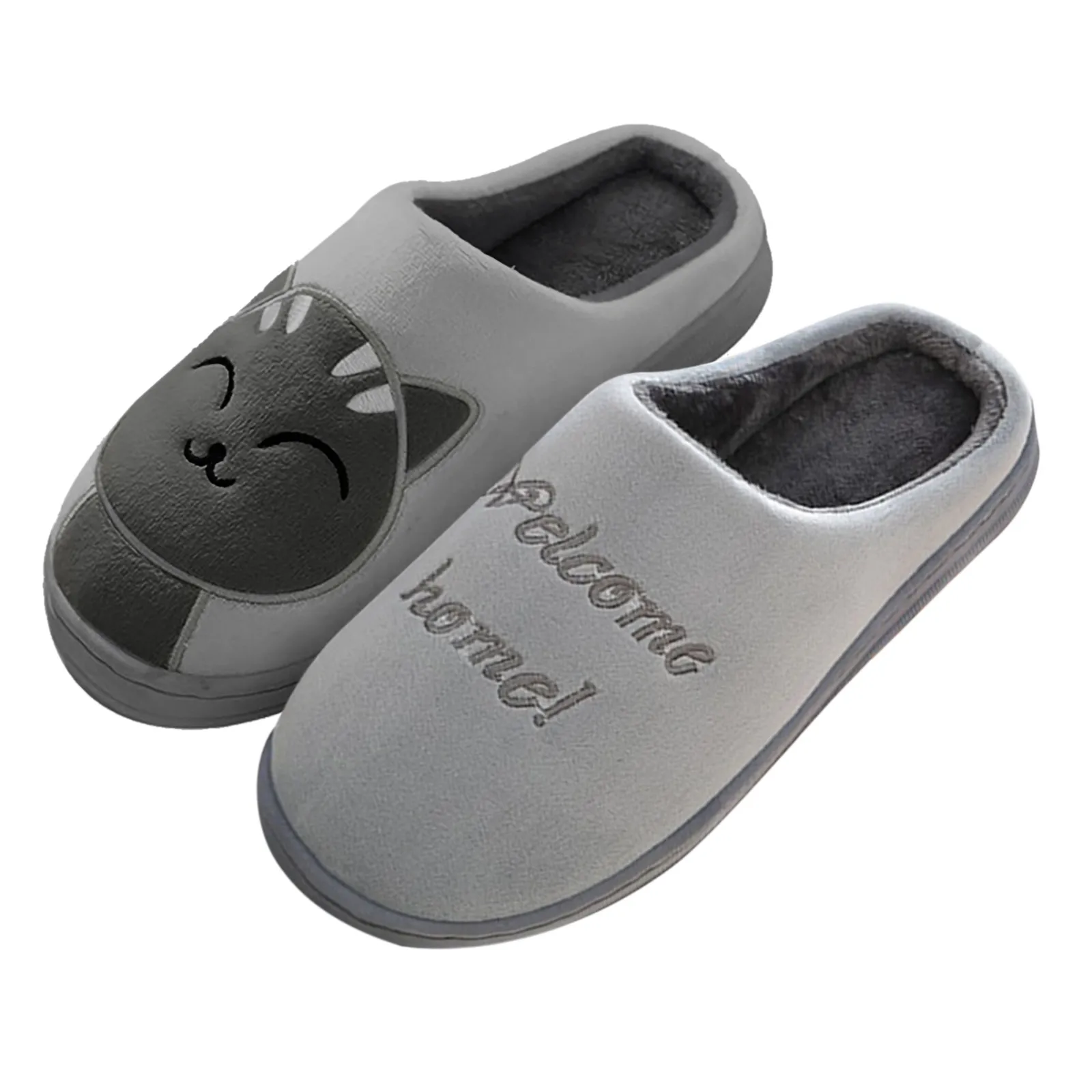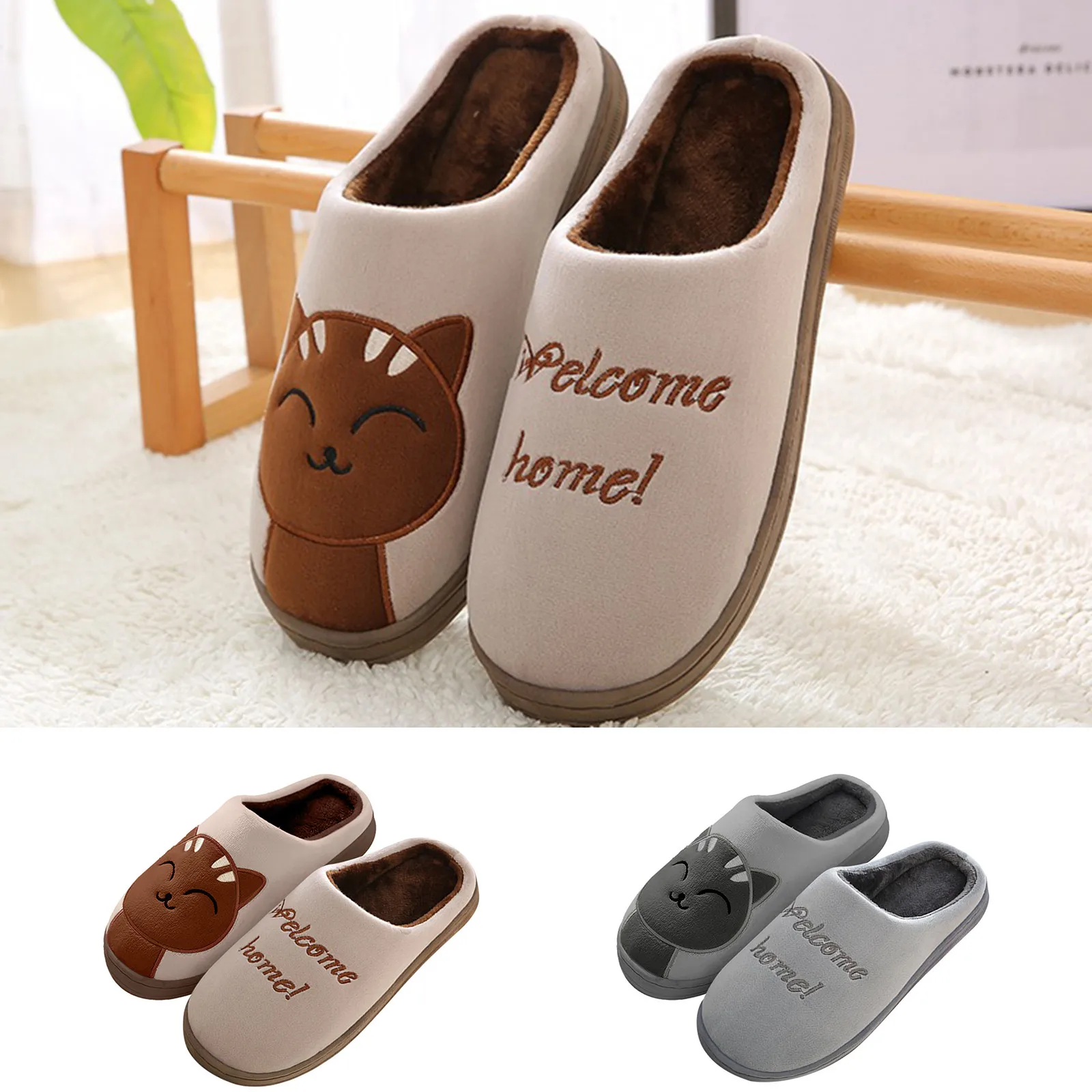 Тапки женские и мужские с мультяшной вышивкой, бархатные шлепанцы на плоской подошве, с круглым носком, домашняя обувь для пар и влюбленных
