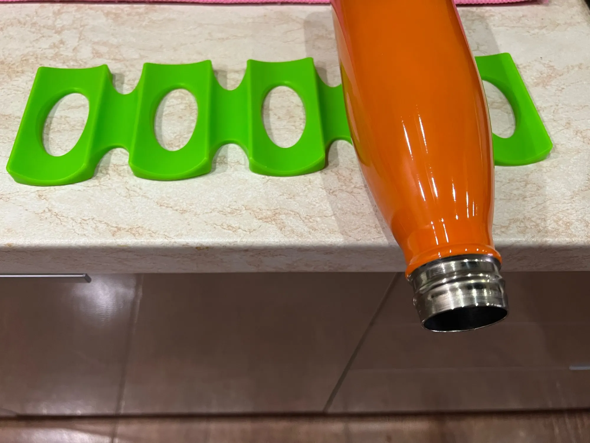 Выглядит нормально. Изготовлен из черной резины. Он может держать несколько пивных бутылок (0.5L) бок о бок. Can't держать соды's бутылки (1.5L) бок о бок. Лучше всего, если он будет сделан из твердого пластика.