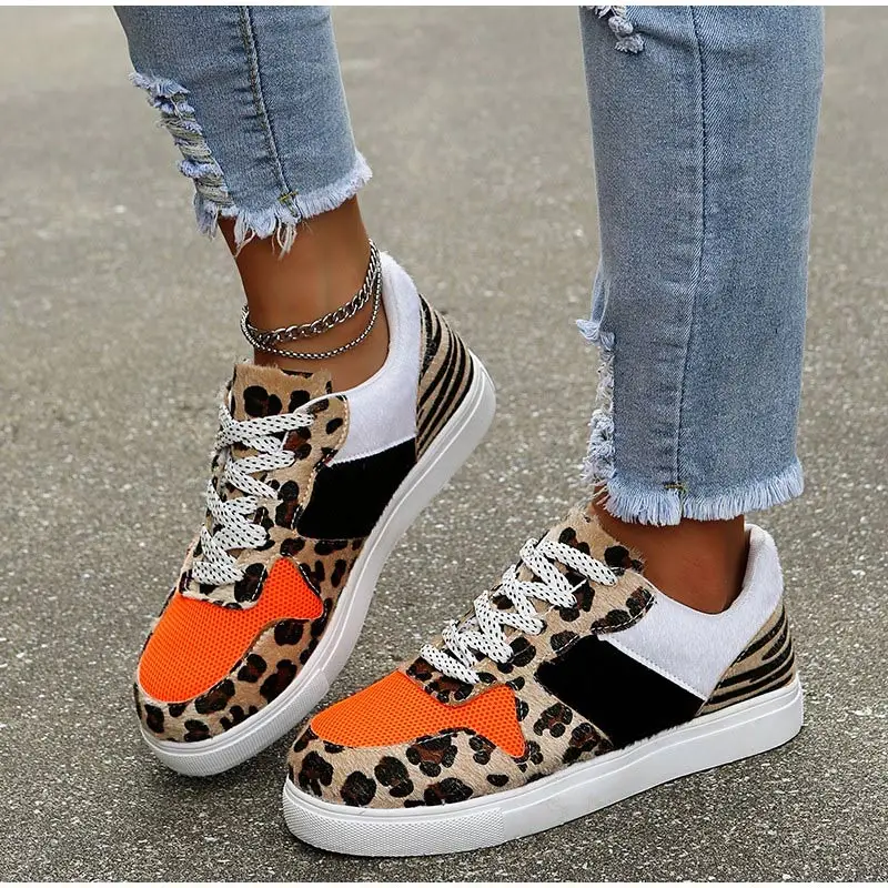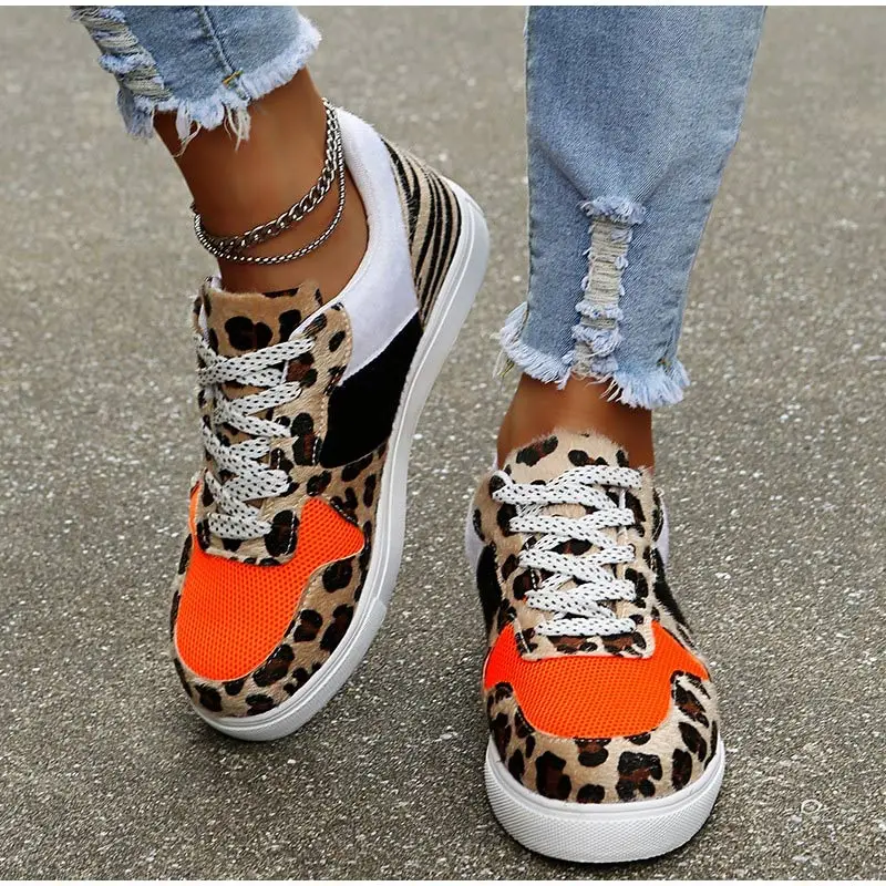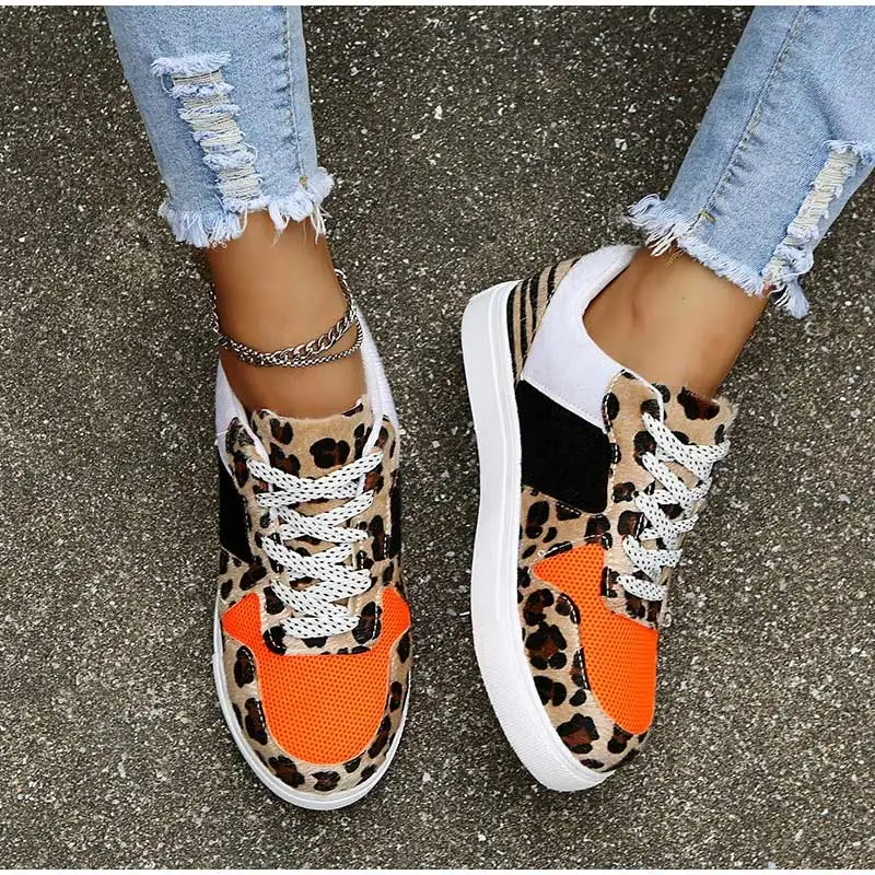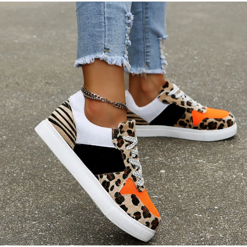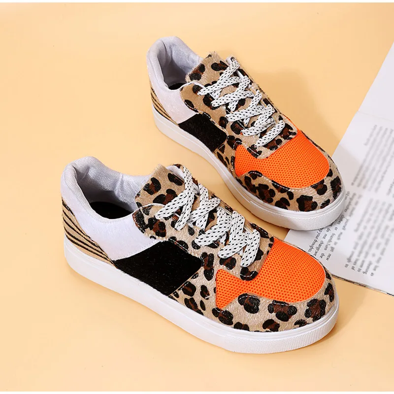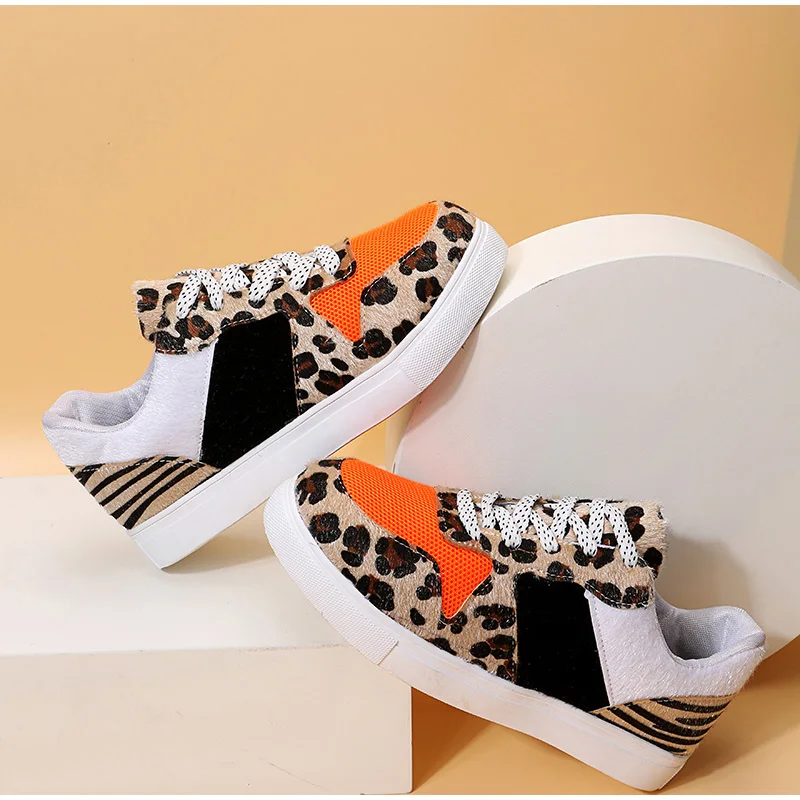 Кроссовки женские с леопардовым принтом, лоскутные, на шнуровке, дышащие, Вулканизированная подошва, Повседневная прогулочная обувь, на осень