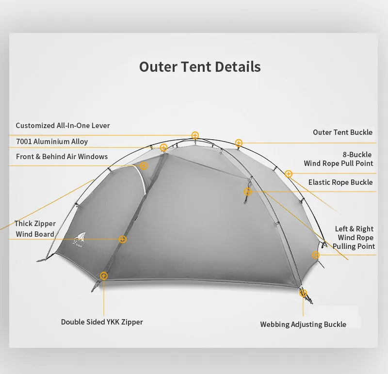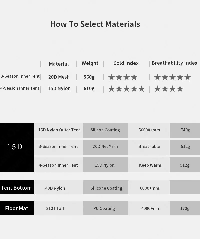 Внутренняя палатка: 3 сезона 20D из пряжи и тюля, 512g / 4 сезонов 15D нейлон