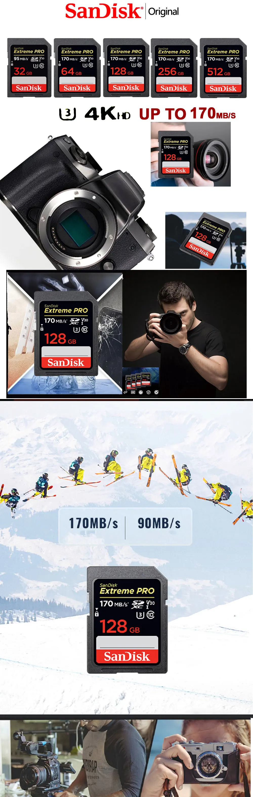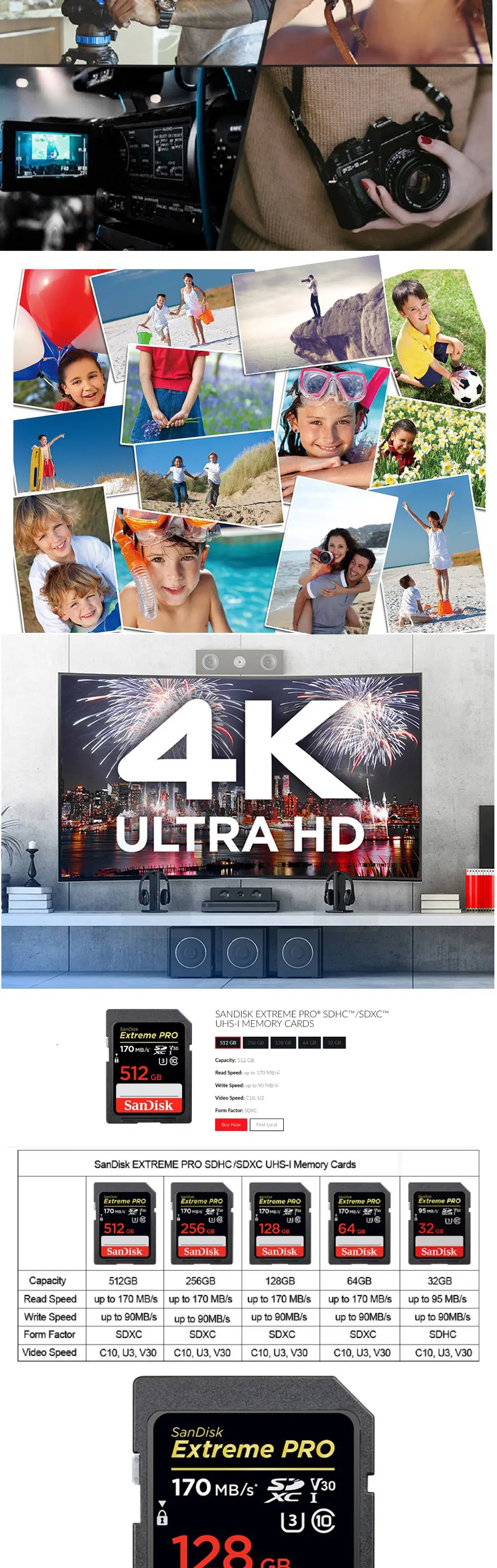 SD-Карта SanDisk Extreme PRO SD, 64 ГБ, SDXCSDHC, класс 10, 128 ГБ, 256 ГБ, TF SD-карты, 32 ГБ, 512 ГБ, SDXC, SDHC для камеры