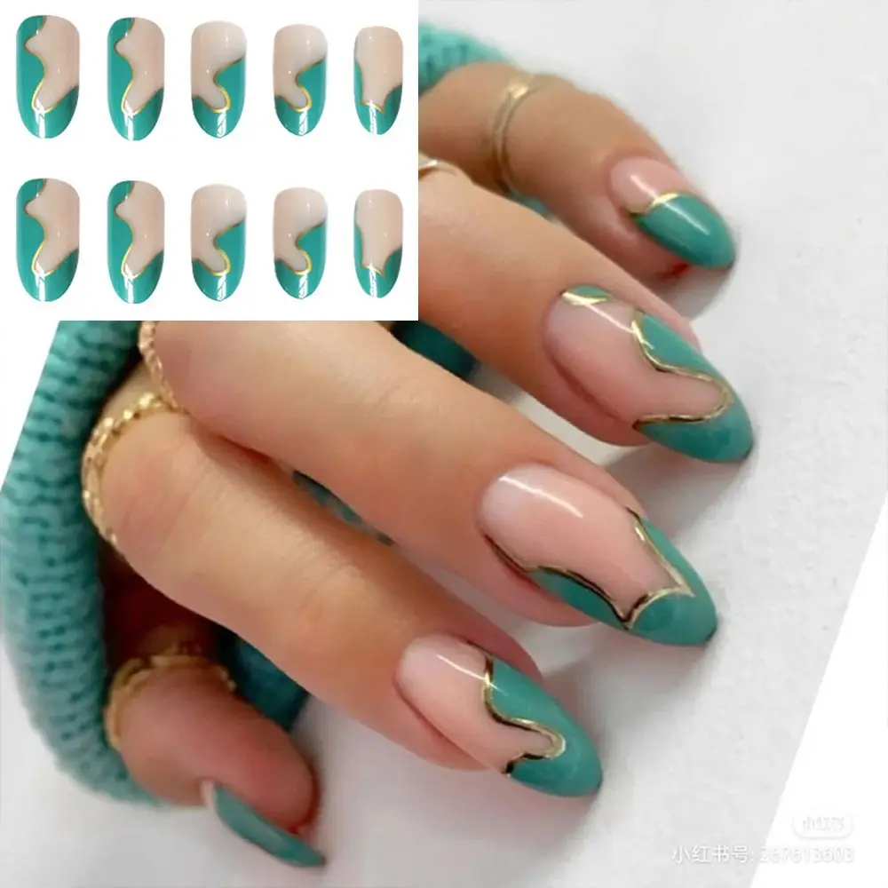 Накладные ногти с миндальным напылением, 24 шт., носимые искусственные ногти с зеленым и золотым краем и клеем, полное покрытие, накладные ногти