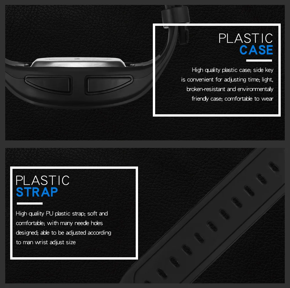 Часы разделены на обновленную версию и обычную версию. Обновленная версия имеет функцию 3D шагомера.В: Каковы особенности продукта?Ответ: счетчик шагов, запись времени упражнений, световой сигнал, будильник, водонепроницаемость 50 метров, ежечасный час, секунды бега, отображение дня недели, система 12/24 часов.Вопрос: Материал изделия:Ответ: высококачественный ABS пластиковый чехол, высококачественный PU пластиковый ремешок, утолщенное и закалённое акриловое зеркало из смолы, задняя крышка из нержавеющей стали, Пряжка из нержавеющей стали.Вопрос: Как насчет водонепроницаемости продукта?Ответ: Все поддерживают водонепроницаемость 50 м и не поддерживают попадание пара горячей воды.В: Как насчет параметров продукта?Ответ: Вес нетто: 41,7 г,