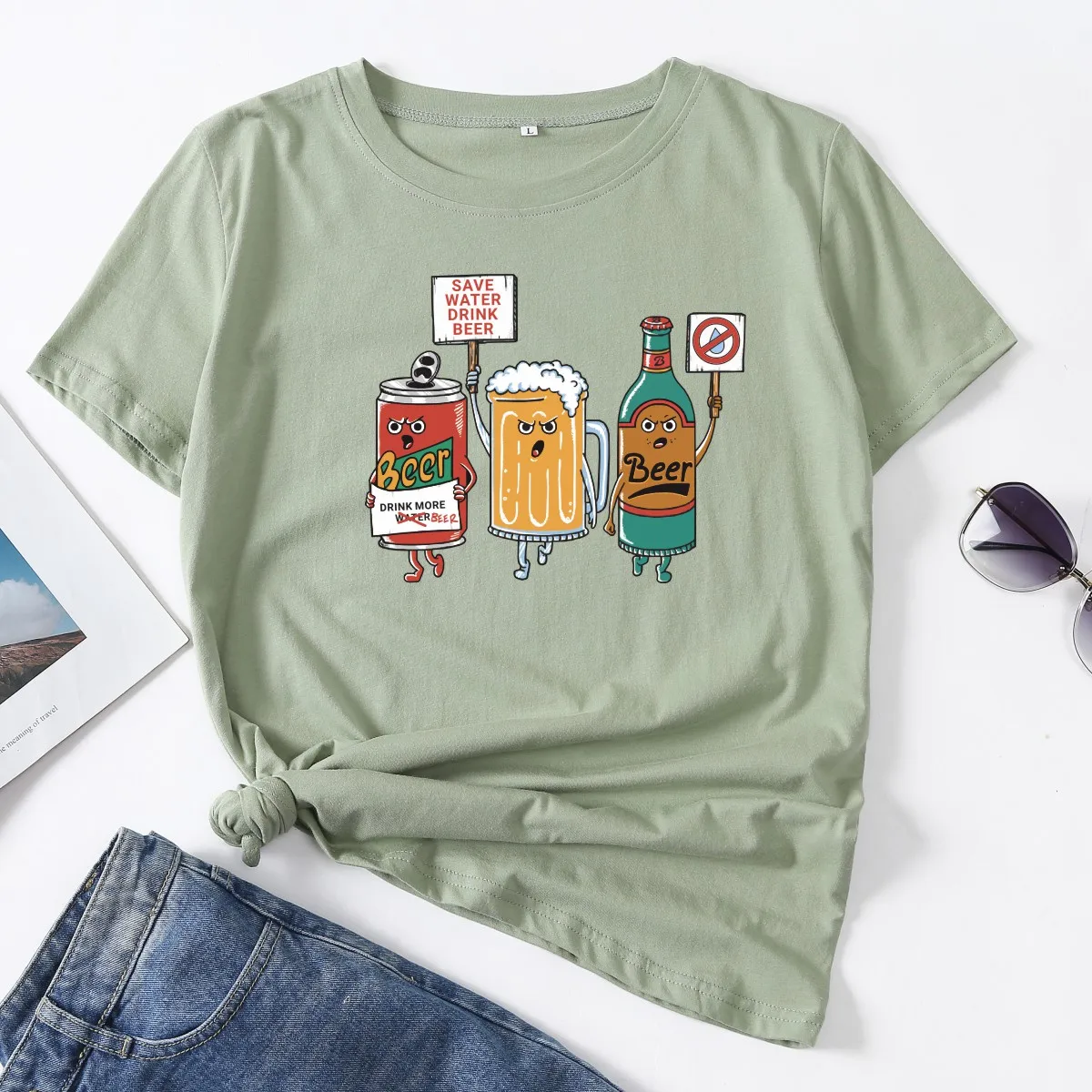 Женская футболка с рисунком воды и пива, женские летние топы хлопок...