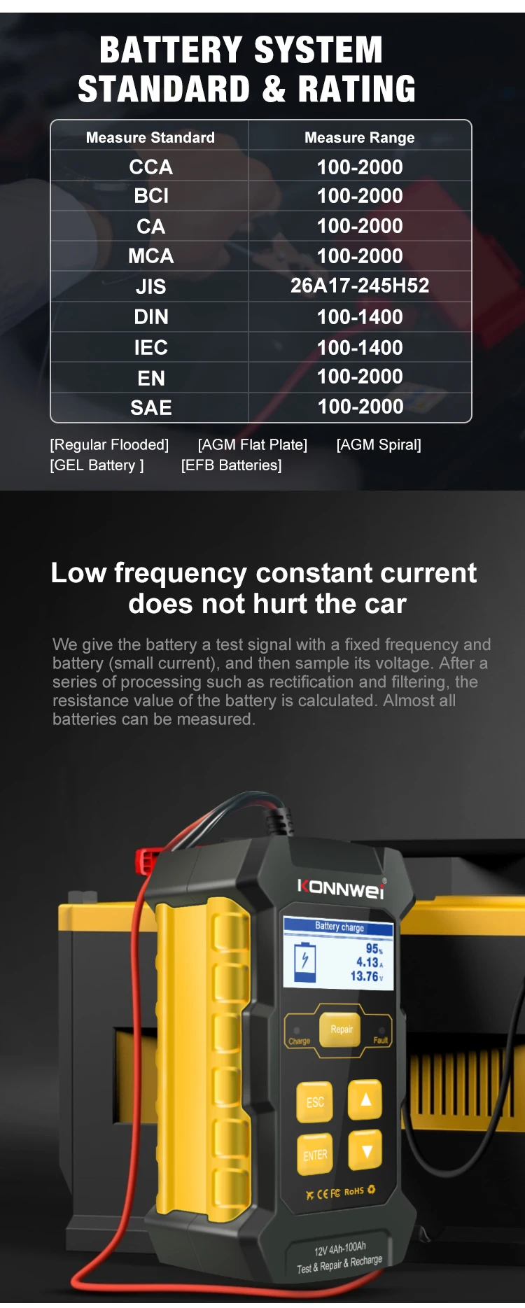 Тестер автомобильного аккумулятора KONNWEI KW510, 12 В, 5 А, свинцо...