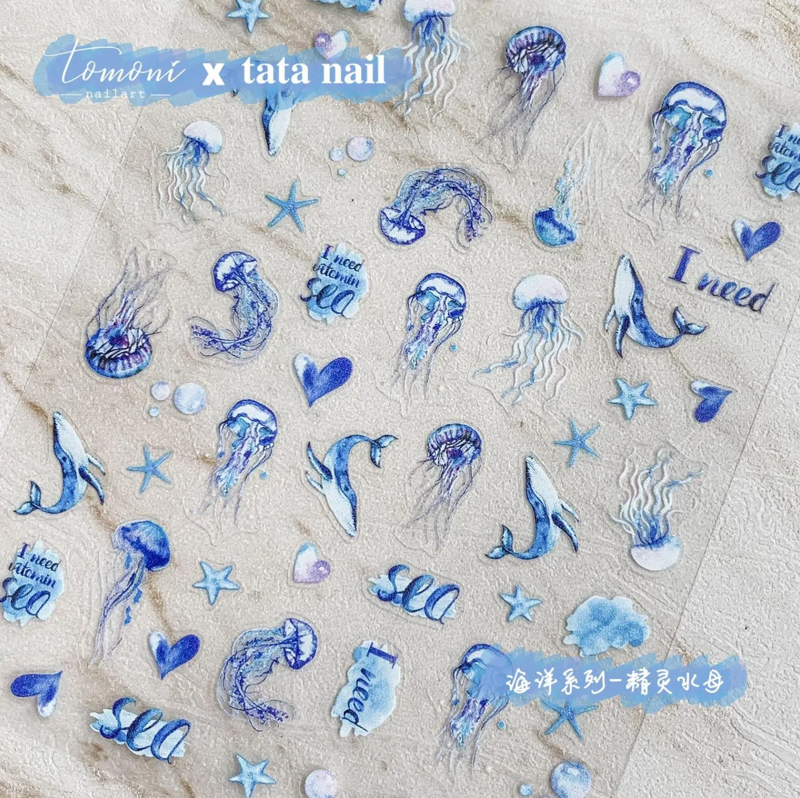Морская история, киты, морские водоросли, высокое качество, 3D гравированные наклейки для ногтей, украшения для дизайна ногтей, наклейки для ногтей