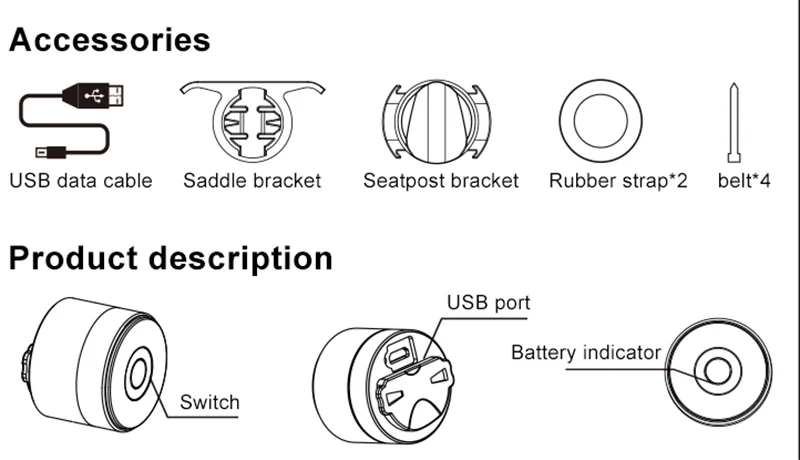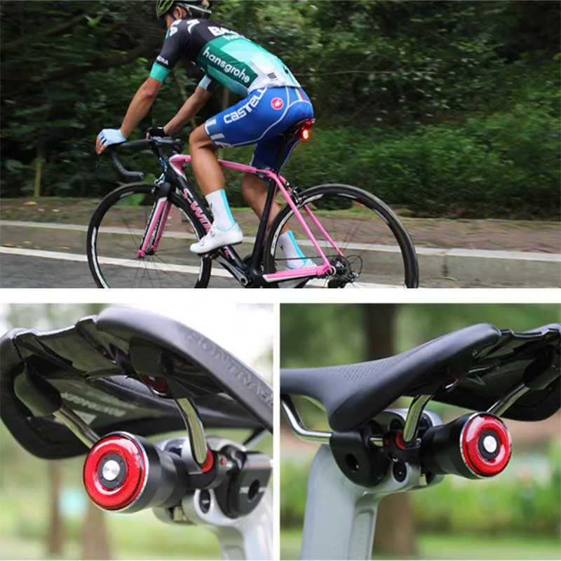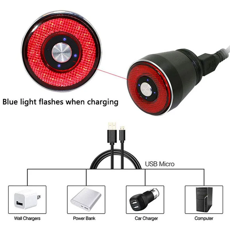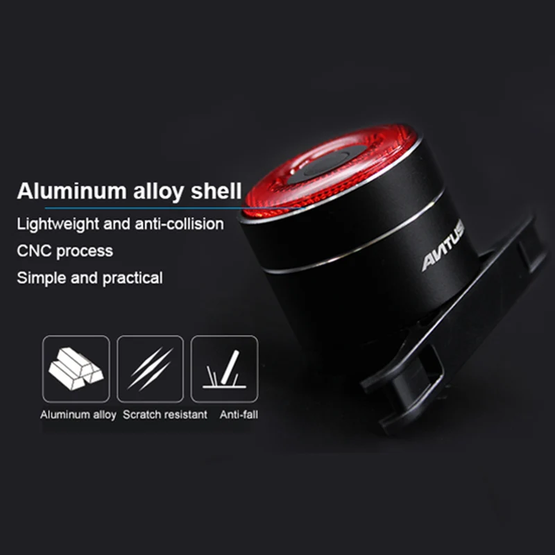 4 режима: яркий-дышащий-мигающий-SOSЗарядка: зарядка через USBАккумулятор: 3,7 в 300 мАч полимерный аккумуляторВес: около 33 гРазмер: 30*34*34 ммМатериал: алюминиевый сплав + пластикСтепень водонепроницаемости: IPX6Цвет: черный----------Интеллигентая (ый) Тормозной сенсорДатчик движения тормоза будет работать, а Ультра-яркий свет будет гореть в течение 3 секунд в качестве тормозов и достаточно, чтобы уведомить людей сзади, что вы тормозите1. Умный старт и остановка + Датчик вибрации + датчик освещенности. Двухрежимное сотрудничество, более беззаботное2. Светочувствительный: чувствительный яркий свет, свет автоматически выключается, когда свет тускнеет, свет автоматически включается3. Ударопрочная: подставка в течение 30 секунд, автоматически выключается, включается автоматически после обнаружения вибрацииОсобенности1. Высокая яркость COB красные светодиоды, и имеет 4 режима освещения и долгое время использования. Режим быстрого мигания/30 ч, режим дыхательного света/30 ч, режим серийного мигания/30 ч, режим постоянного освещения/12 ч.2. Кронштейн для седла и кронштейн для подседельного штыря, который подходит для любого дорожного велосипеда. Велосипедный фонарь легко снимается без использования винтов.3. Простой метод зарядки через USB. Он поставляется с кабелем для зарядки, так что вы можете использовать зарядное устройство для зарядки задних фонарей вне питания в любое время, даже на открытом воздухе. Мигает синий индикатор, указывающий на недостаточную мощность. Во время зарядки всегда горит синий свет, а синий свет выключен. Это означает, что аккумулятор полностью заряжен.