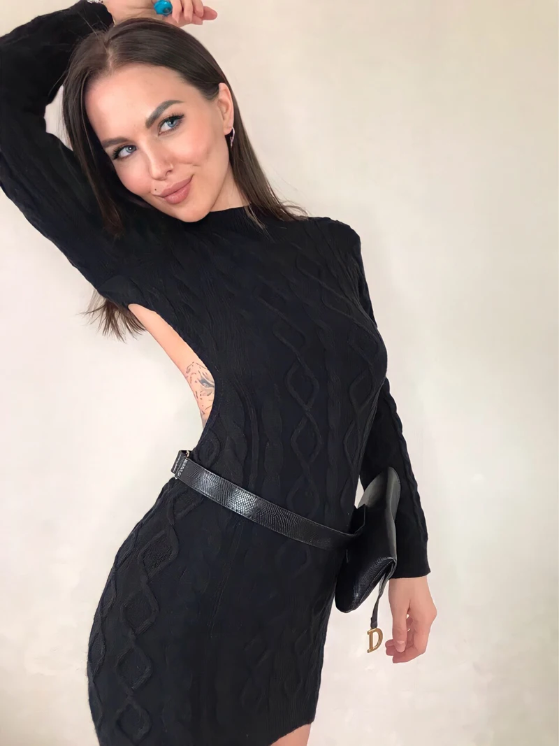 Женское трикотажное мини-платье с открытой спиной и длинным рукавом