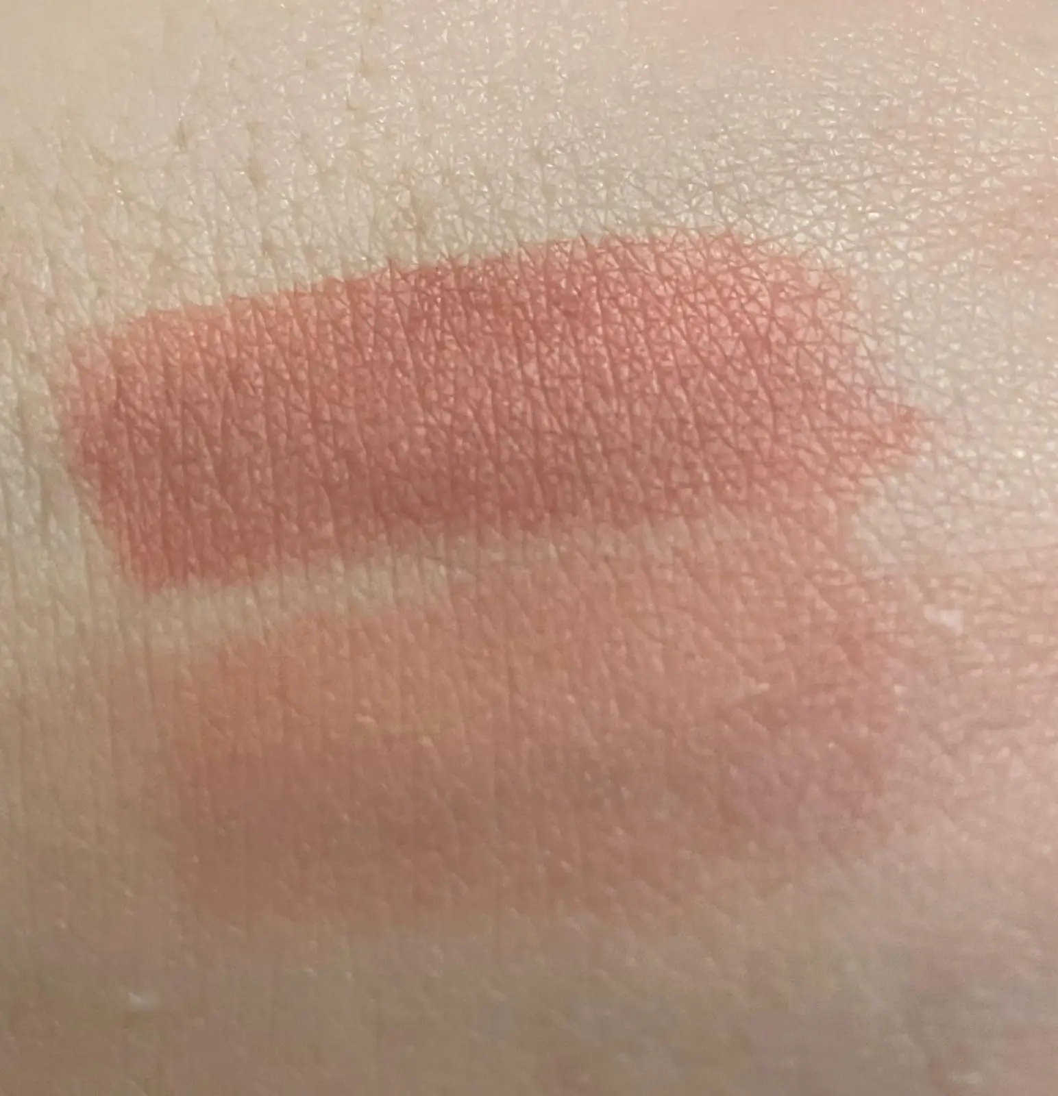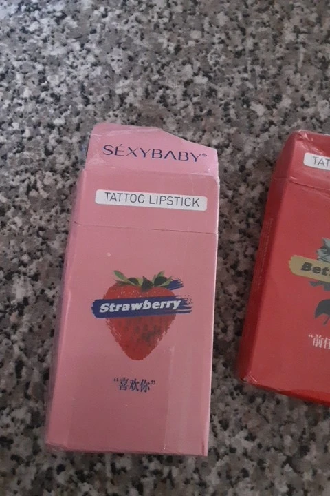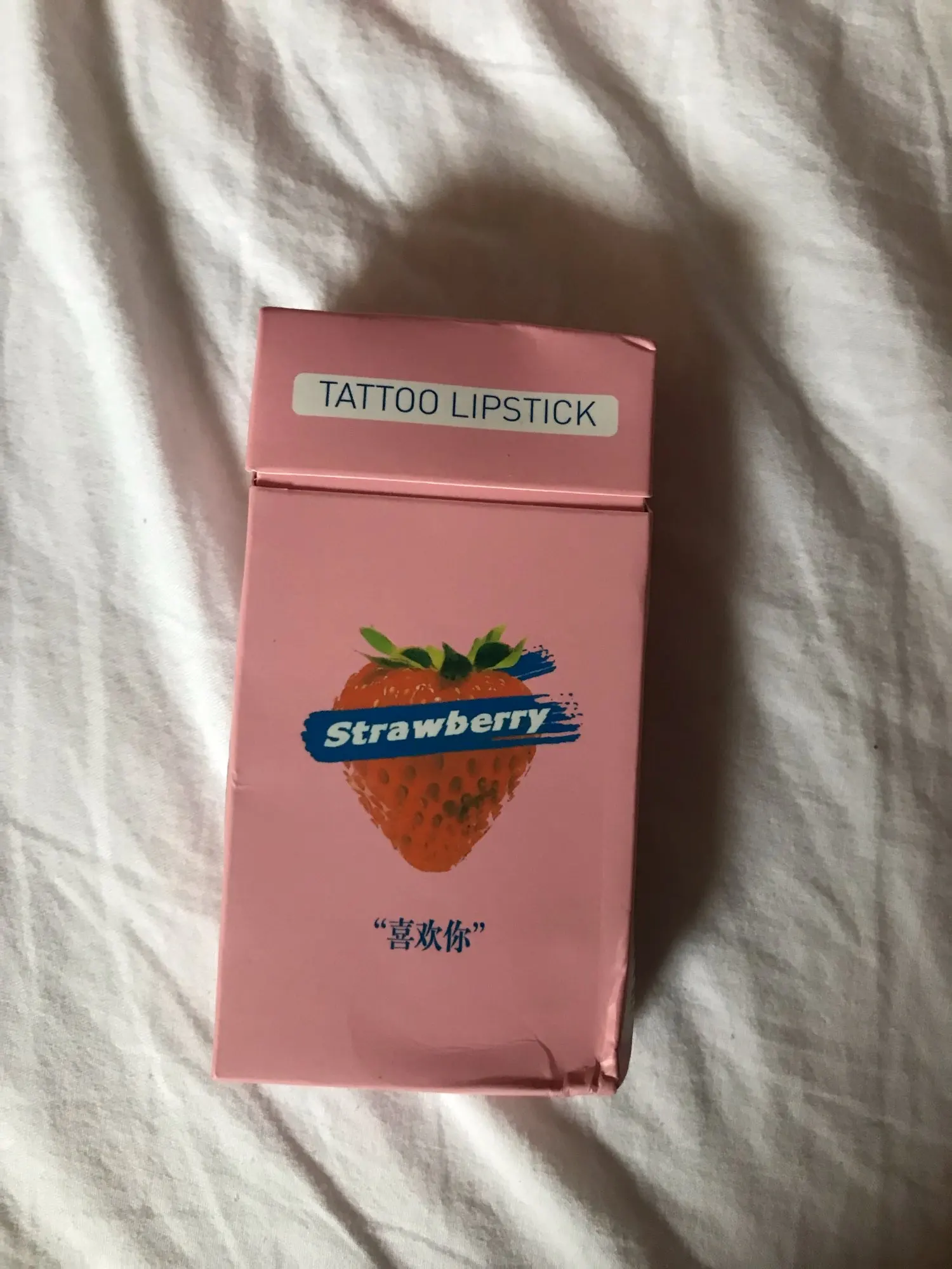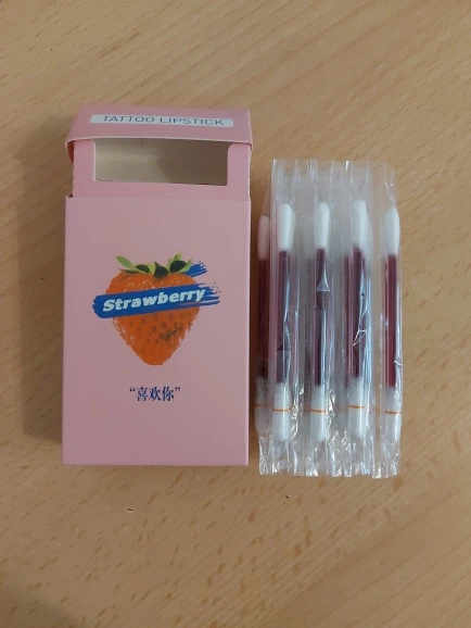 Как тинт работает, верхняя полоса сразу после нанесения, нижняя полоса цвет после влажной салфетки. Сушит губы, но это нормально для тинта. Почти не пахнет, едва уловимый запах клубники. Можно брать с собой одну палочку, легко открыть без ножниц, когда ломаешь, то ничего не капает. Коробочка не помялась, думаю использовать для сигарет :)