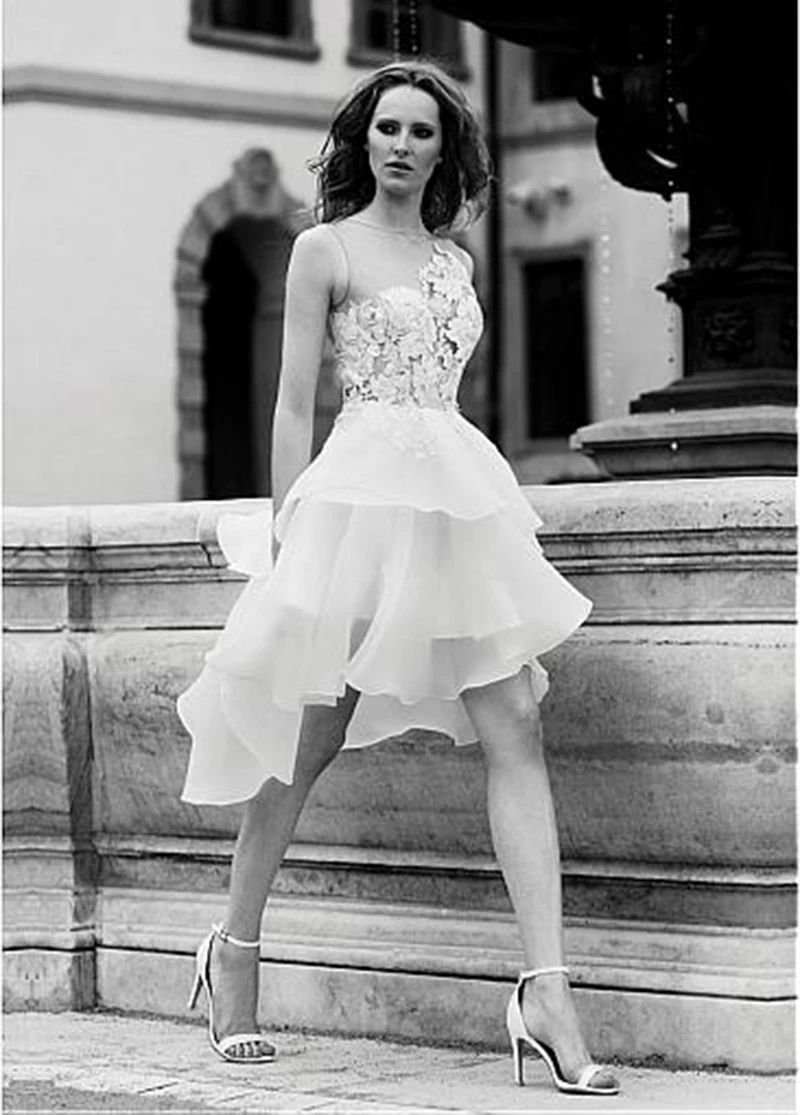 Сексуальное ТРАПЕЦИЕВИДНОЕ свадебное платье с аппликацией, кружевной иллюзионный лиф, многоярусная юбка, белые короткие пляжные свадебные платья в стиле бохо с круглым вырезом