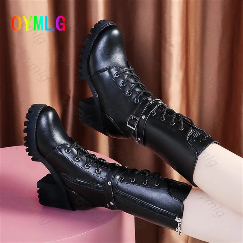 Зимние ботинки; Женская обувь из искусственной кожи на квадратном каблуке с круглым носком; Модные пикантные ботильоны на платформе, визуально увеличивающие рост, на шнуровке и высоком каблуке