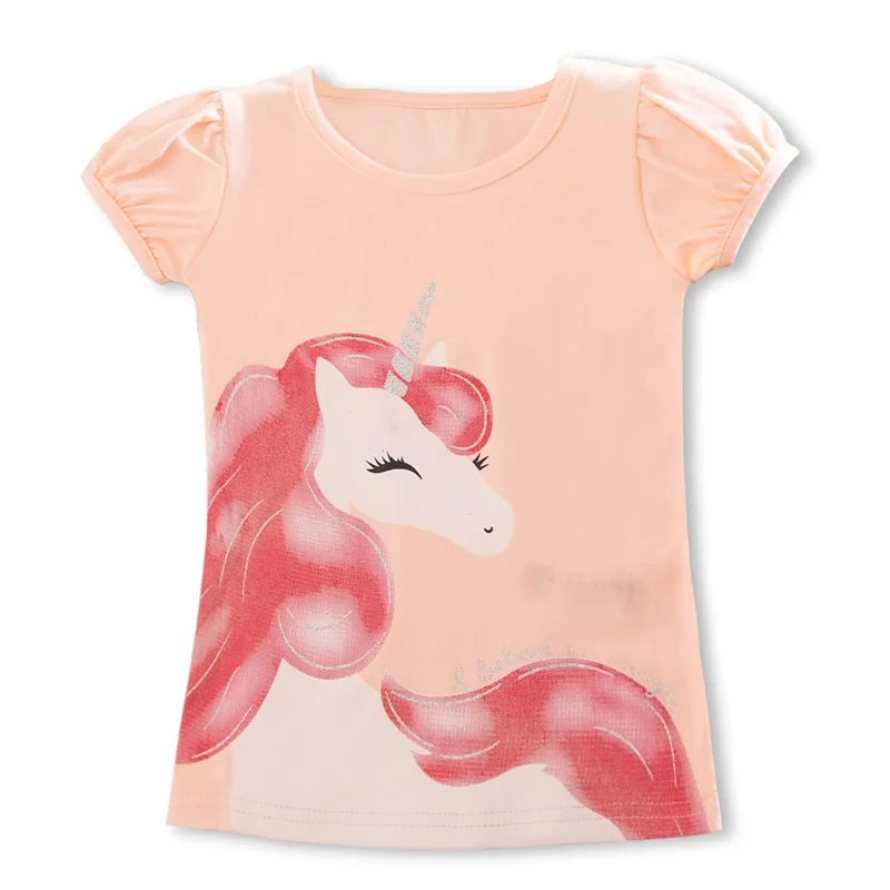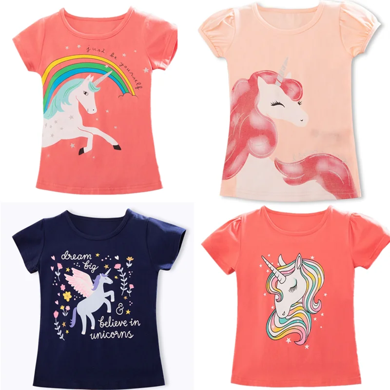 Летняя футболка с рукавом, футболка для девочек с крышками, единорог, одежда с мультяшным принтом для детей 2021, детская блузка с круглым вырезом для детей