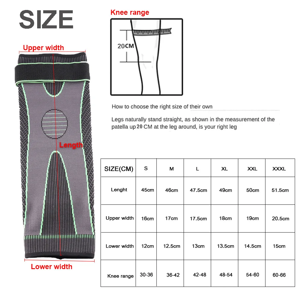 Цвет: черный, зеленыйМатериал: спандекс 25%, полиэстер 33%, нейлон 42%Размер: M(36-42 см),L(42-48 см),XL(46-52 см)Вес: 120 гПрименение: профилактика или реабилитация после травм, все виды физических упражнений.Особенности:1. Полноценная эластичность обеспечивает более облегающий и более комфортный поддерживающий колено, сохраняет колено в тепле должным образом и снимает хроническую боль при артрите.2. Высокая эластичность обеспечивает большую посадку и более удобную поддержку колена.3. Согревает колено и снимает боль при хроническом артрите.4. Подходит для различных занятий фитнесом и спортом.