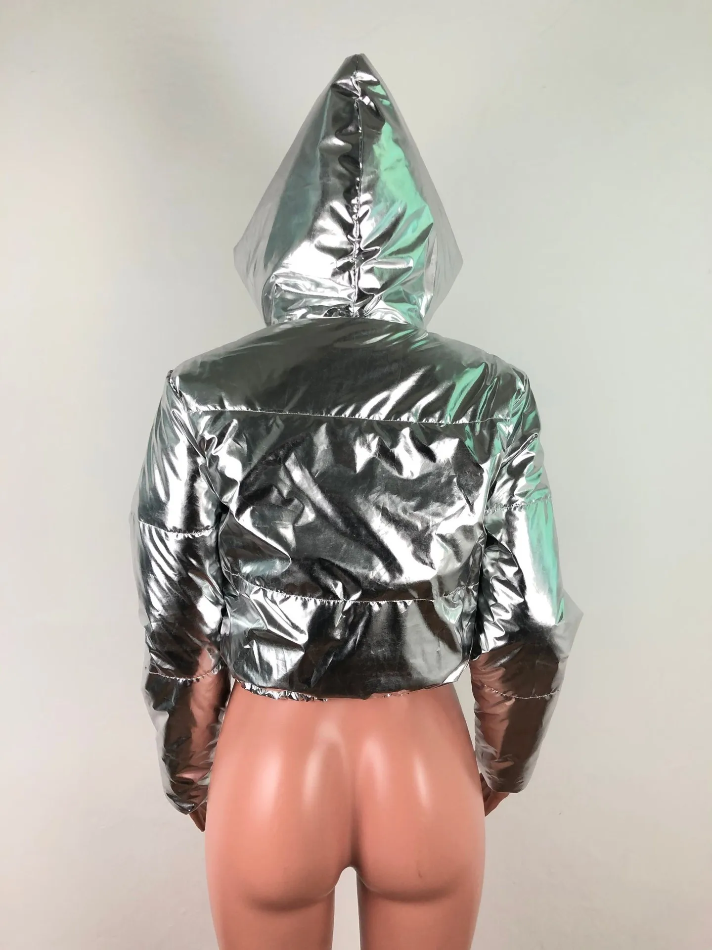 Блестящая женская куртка-пуховик на осень, серебристые короткие парки, женские модные пальто с капюшоном и подкладкой, уличная одежда, Женское пальто для ночного клуба, 2021