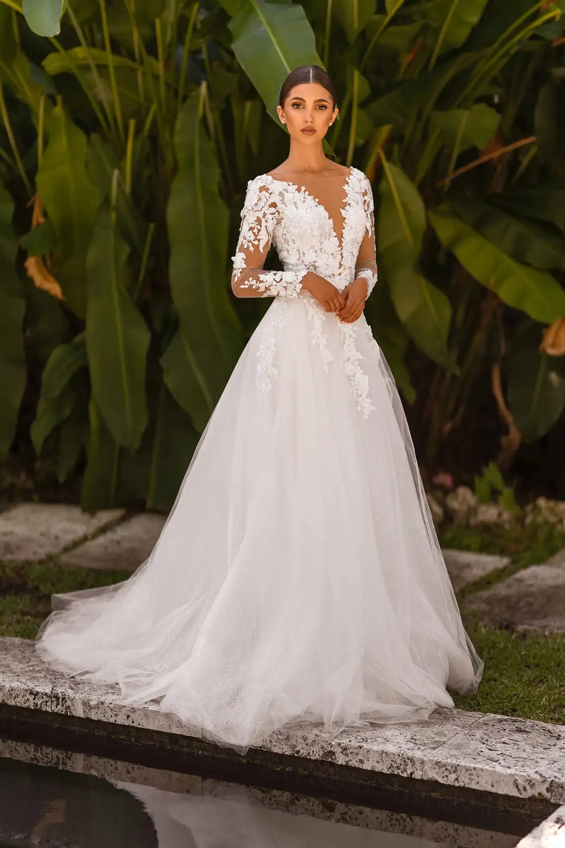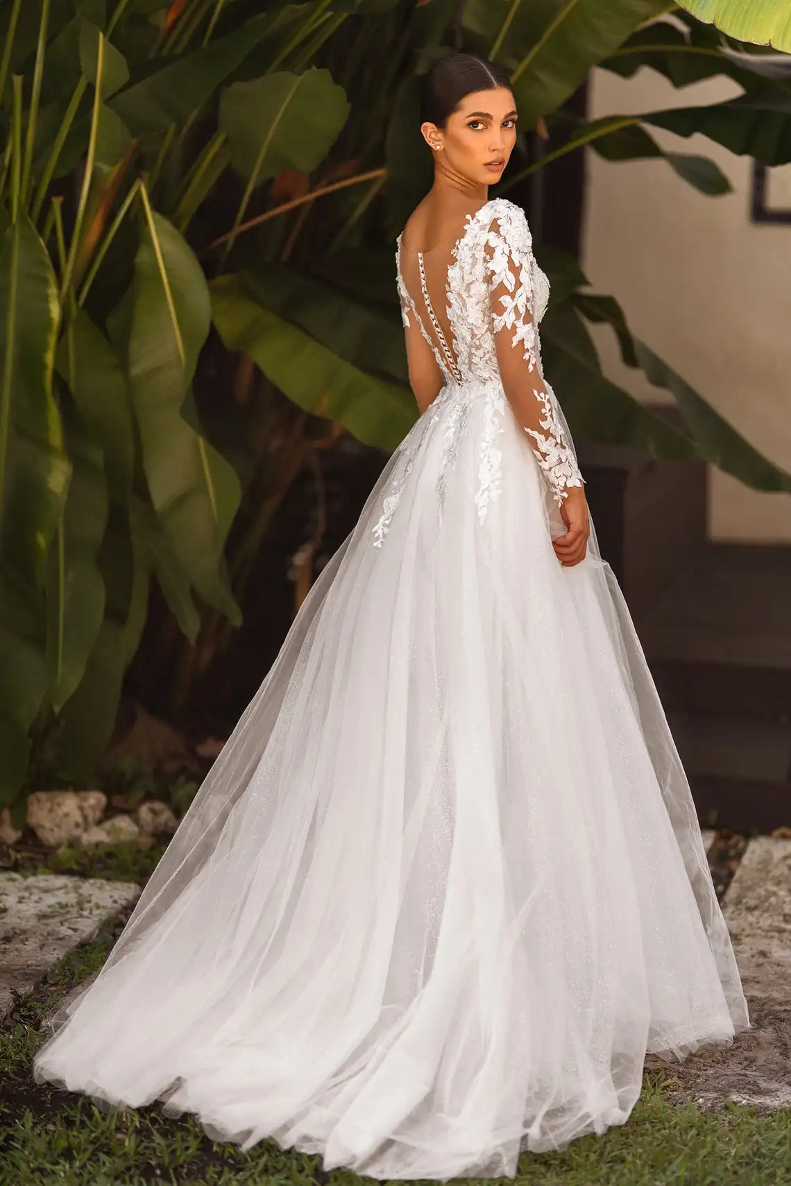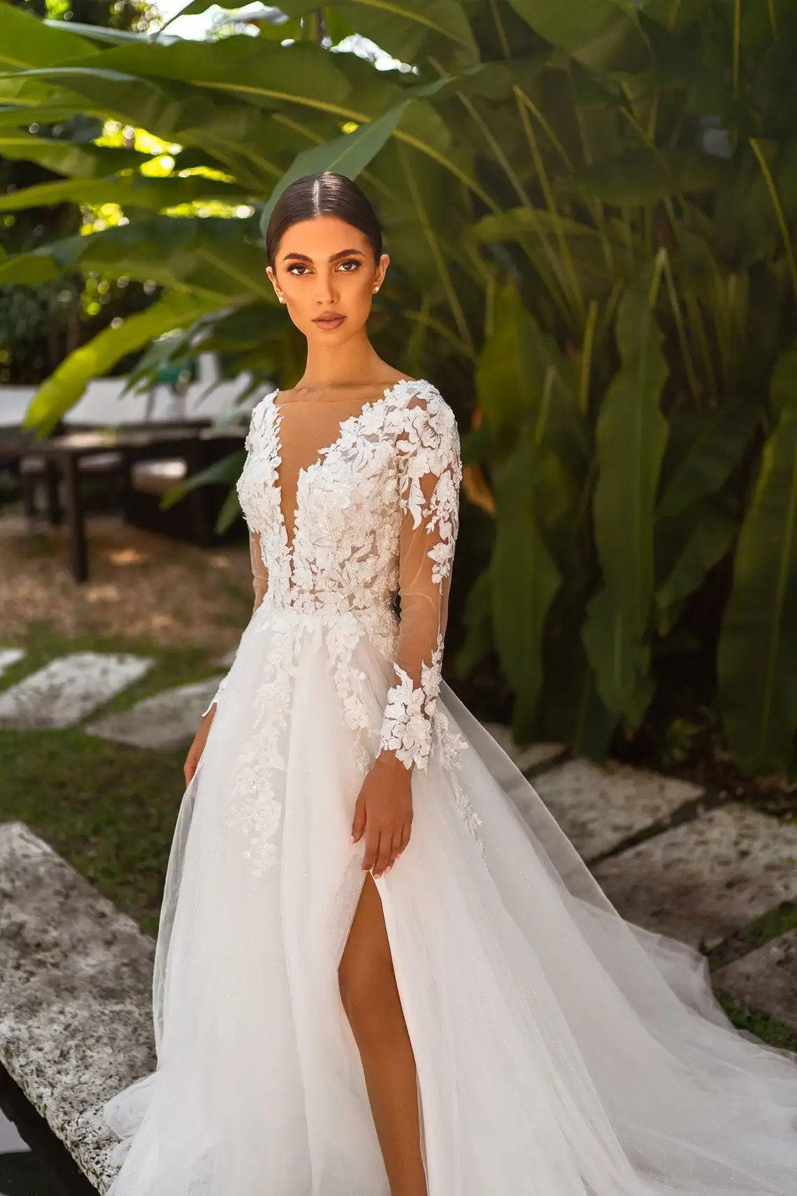 Романтическое кружевное свадебное платье цвета слоновой кости из тюля с длинными рукавами, 2021, ТРАПЕЦИЕВИДНОЕ, с разрезом, свадебное платье Макси