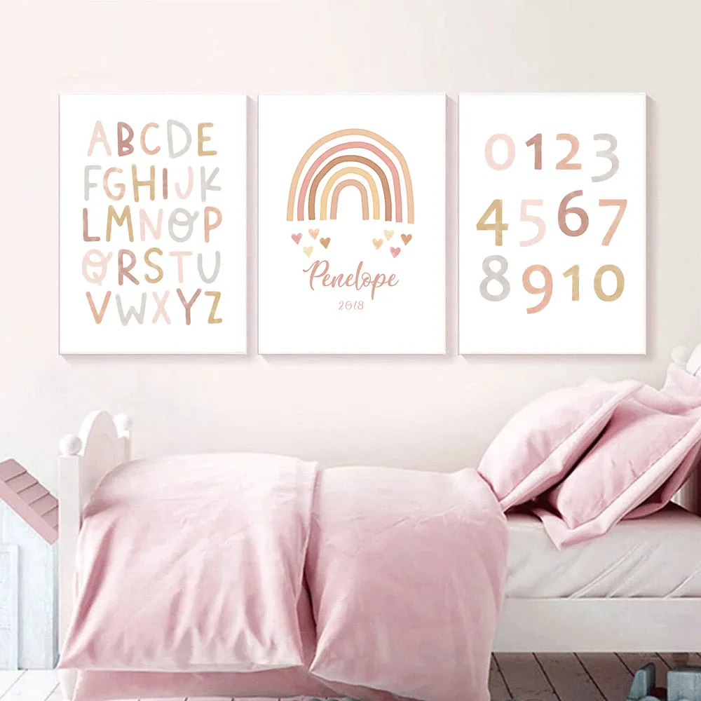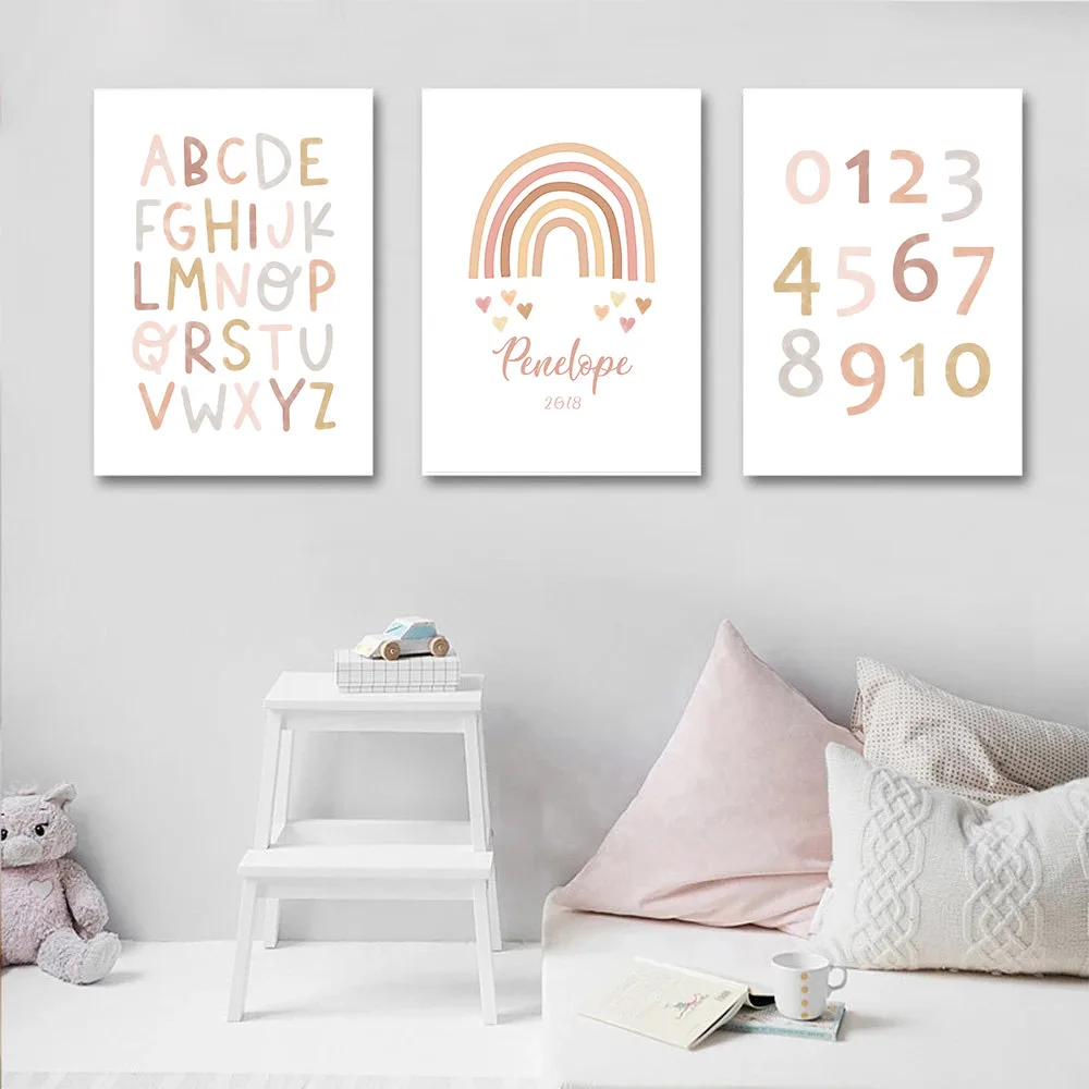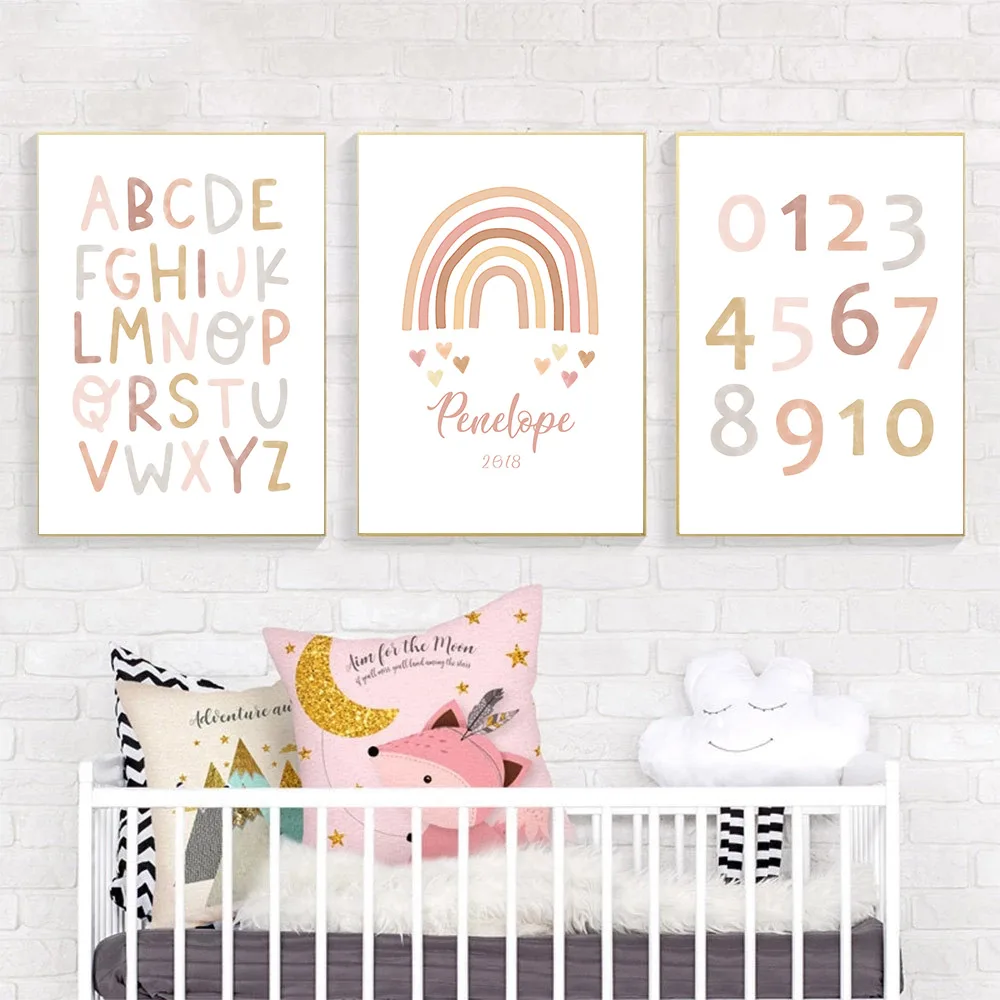 Алфавит и цифры АБС, холст, плакат, радужная печать, индивидуальное имя, рождение, настенная живопись, искусство, декор детской комнаты