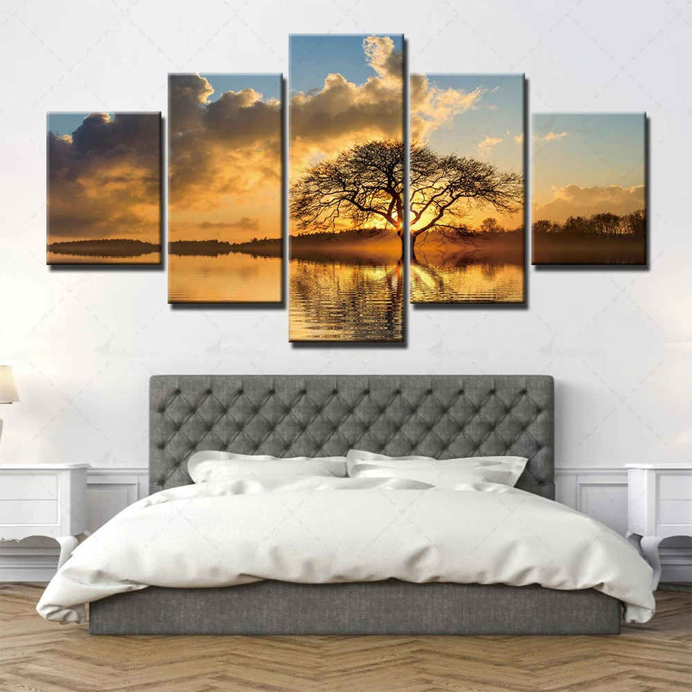 Настенная картина на холсте с изображением пейзажа для украшения дома, Настенная картина с изображением дерева, Модульная картина С закатом, современный плакат с 5 панелями для рамки гостиной