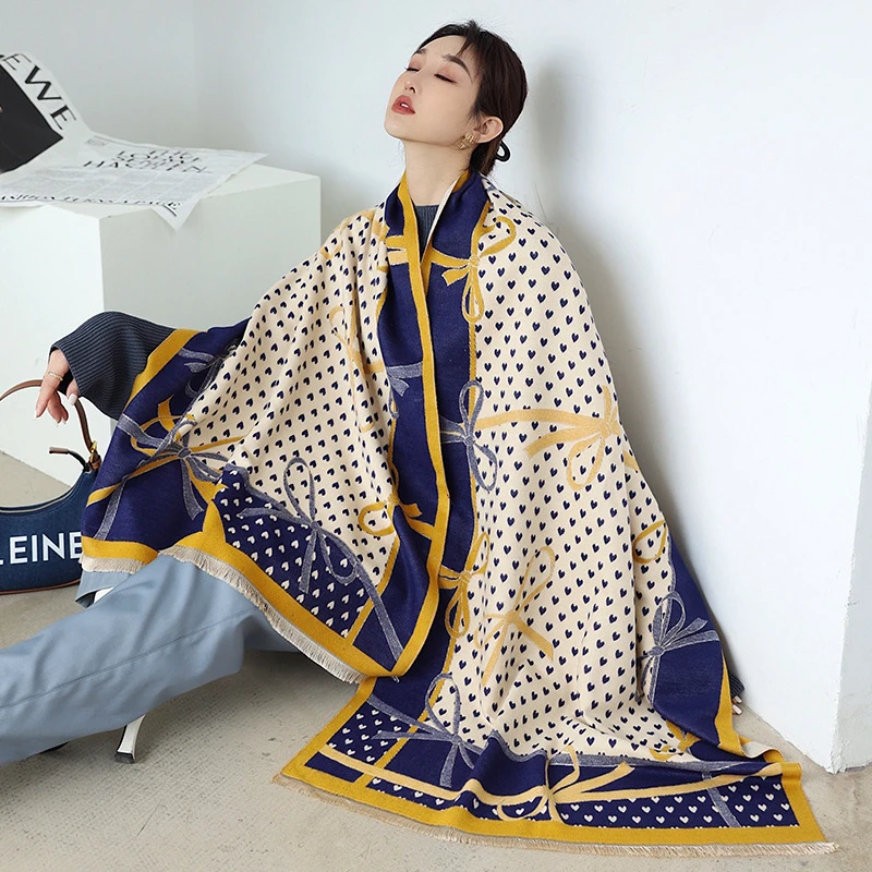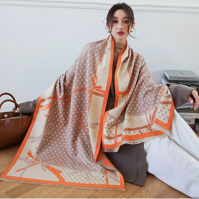 Осенний кашемировый шарф, женская дизайнерская шаль из пашмины с милым бантом, двусторонние плотные шарфы, зимняя теплая накидка, шарфы-пончо
