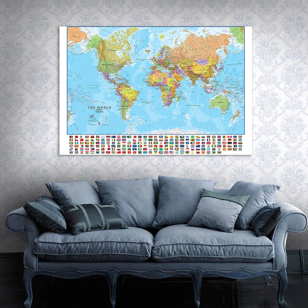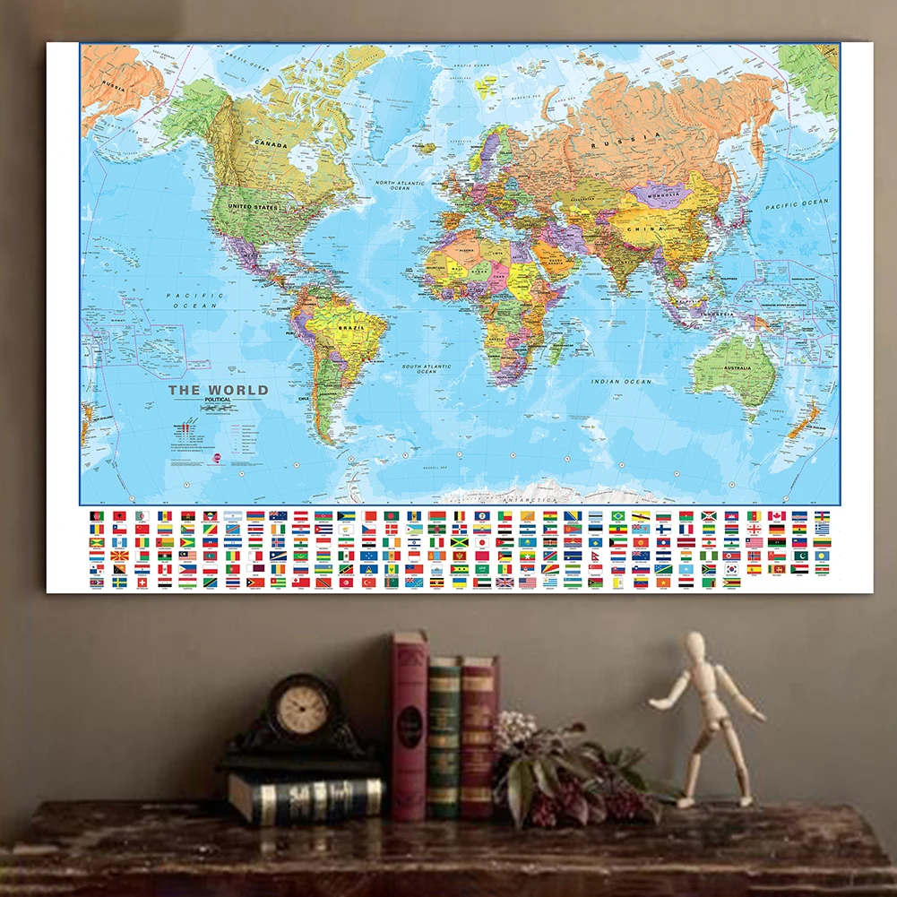 140*100 см политическая карта мира с национальными флагами, большая Нетканая Картина на холсте, настенный художественный плакат, домашний декор, школьные принадлежности