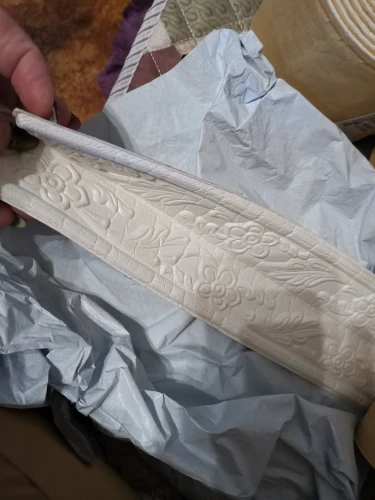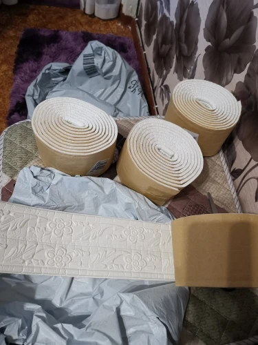 Пришли плинтуса скрученые в рулончики, из-за этого отличаются от фото, выглядят морщинисто. Клеевая основа хорошая, держится крепко. Брала для гардеробной комнаты, как потолочный плинтус, смотрится не плохо. Спасибо.