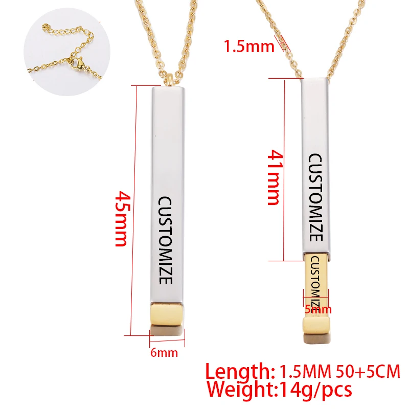 1. Высокое качество, 100% новый бренд2. Материал: нержавеющая сталь3. Размер подвески: 45*6 мм, Длина цепочки: 50 + 5 см4. Цвет: золото, розовое золото, черный5. Количество: 20 шт./лот6 посылка: opp
