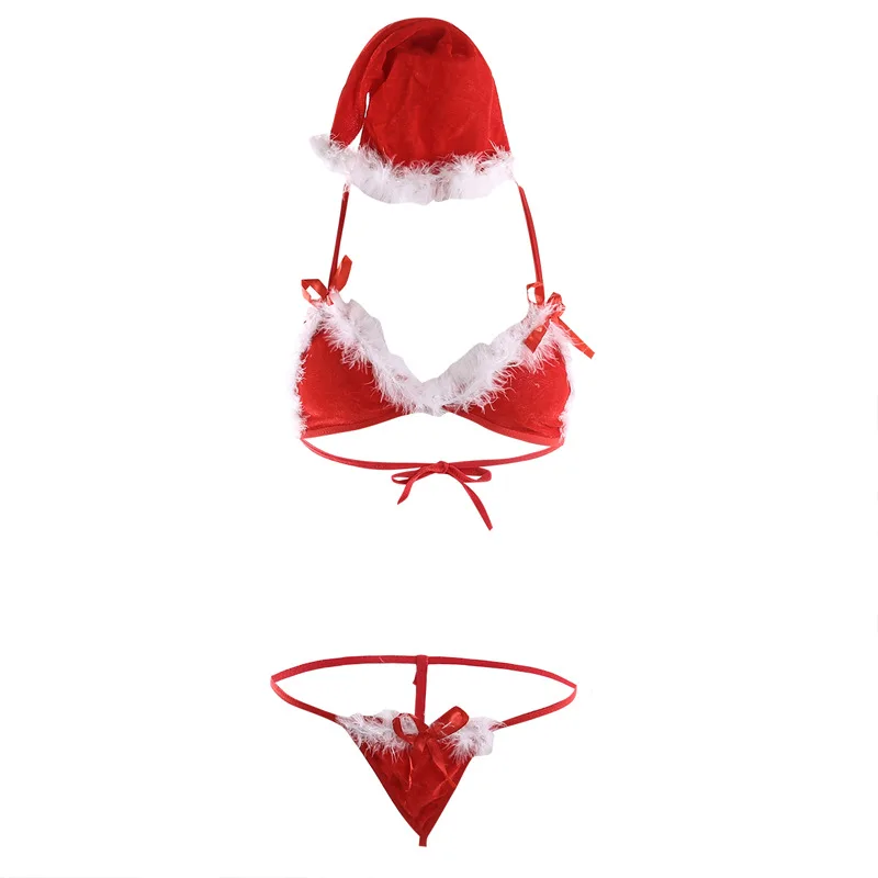 Новый сексуальный комплект нижнего белья, женское трехконечное бикини, Рождественский костюм, бюстгальтер с вырезами и бантом, стринги, женское нижнее белье, рождественский подарок