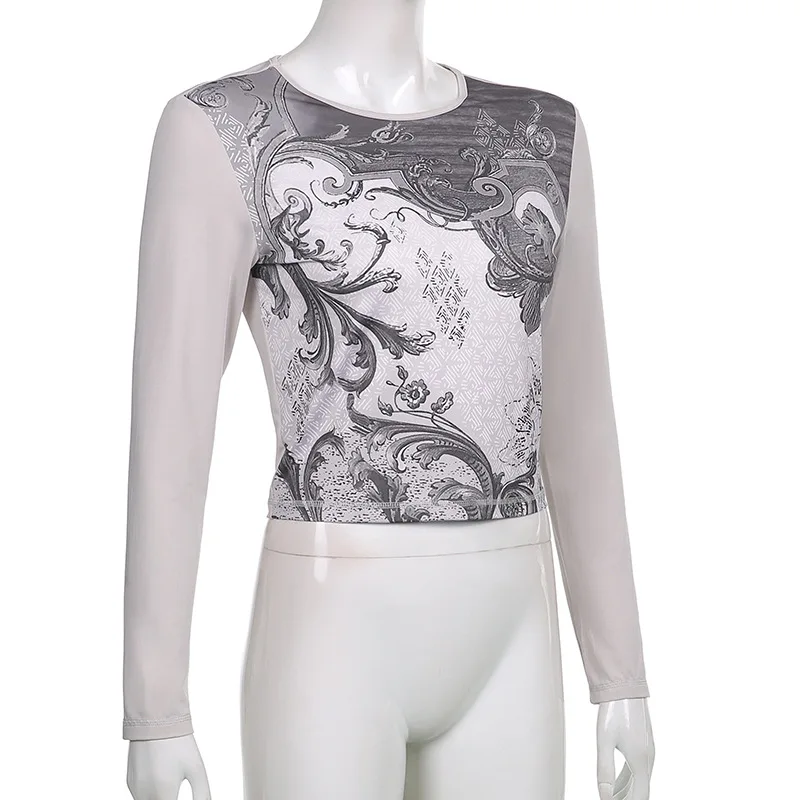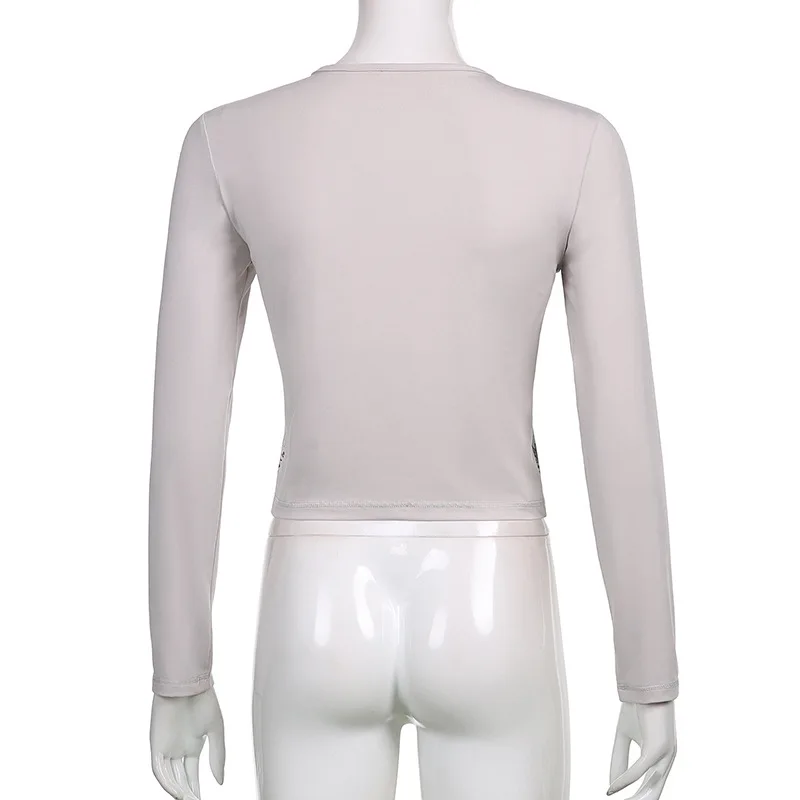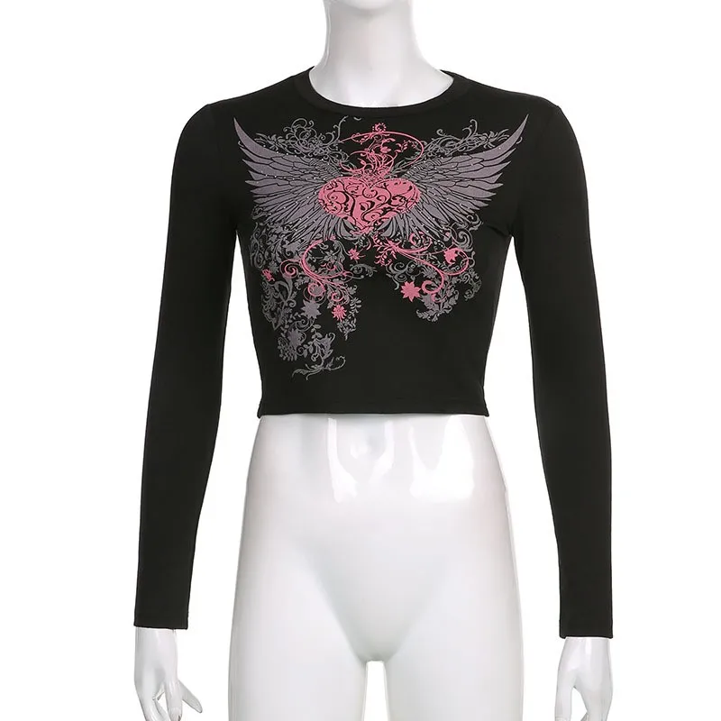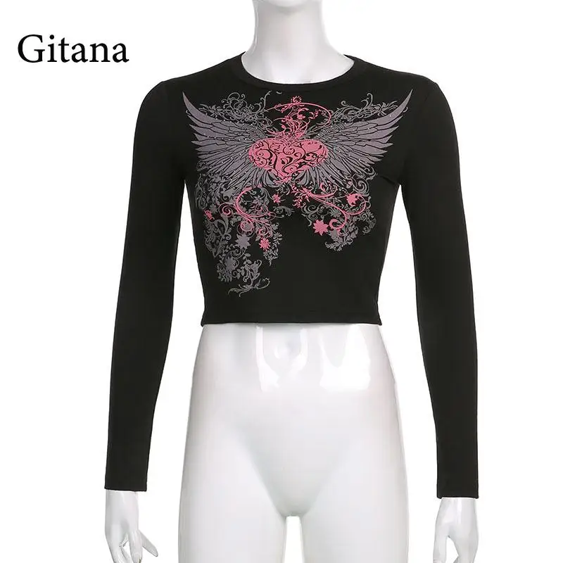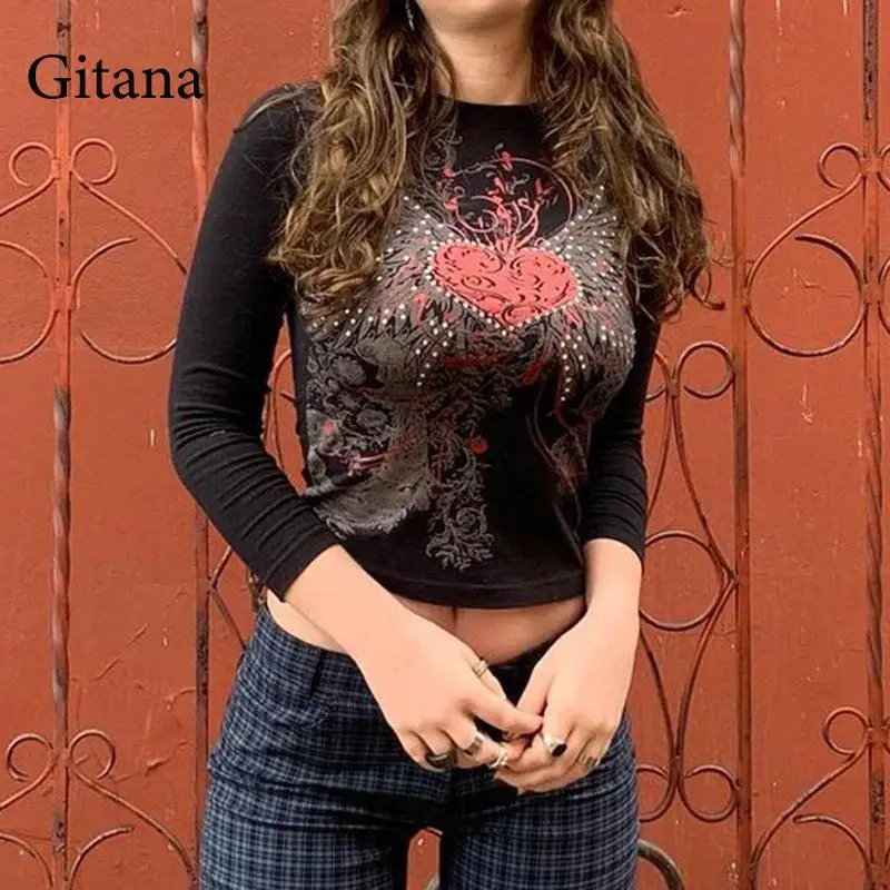 Винтажная Футболка Gitana с алмазным принтом, женский укороченный Топ с длинным рукавом, осенняя Повседневная футболка гранж с Fairycore 2021