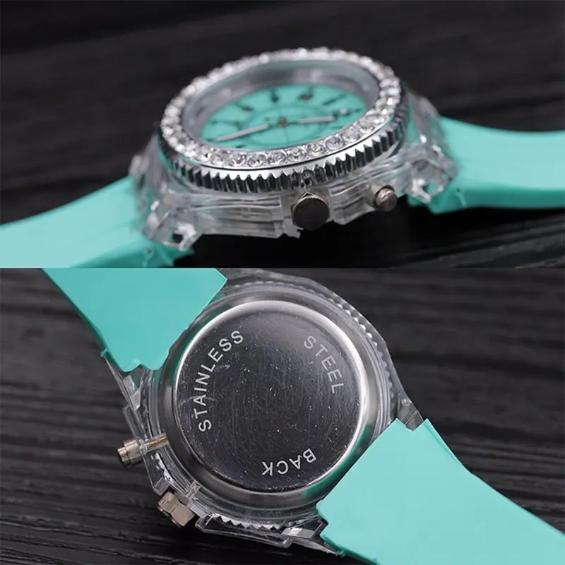Особенность 1: светодиодная вспышка Особенность 2: мягкий силиконовый ремешок для часов Особенность 3: со стразами вокруг циферблата Подходит для: подарков, вечеринок, промоакций и т. Д.